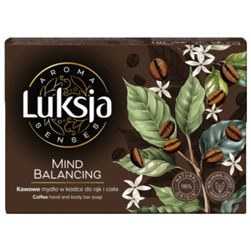 Kremowe mydło w kostce Luksja Aroma Senses Mind Balancing zawiera środki myjące roślinnego pochodzenia, nawilżające składniki oraz wygładzające drobinki kawy. Zapewnia skórze pielęgnację i miękkość, skutecznie ją oczyszczając. Ciepły, bogaty zapach kawy przynosi zmysłom ukojenie.