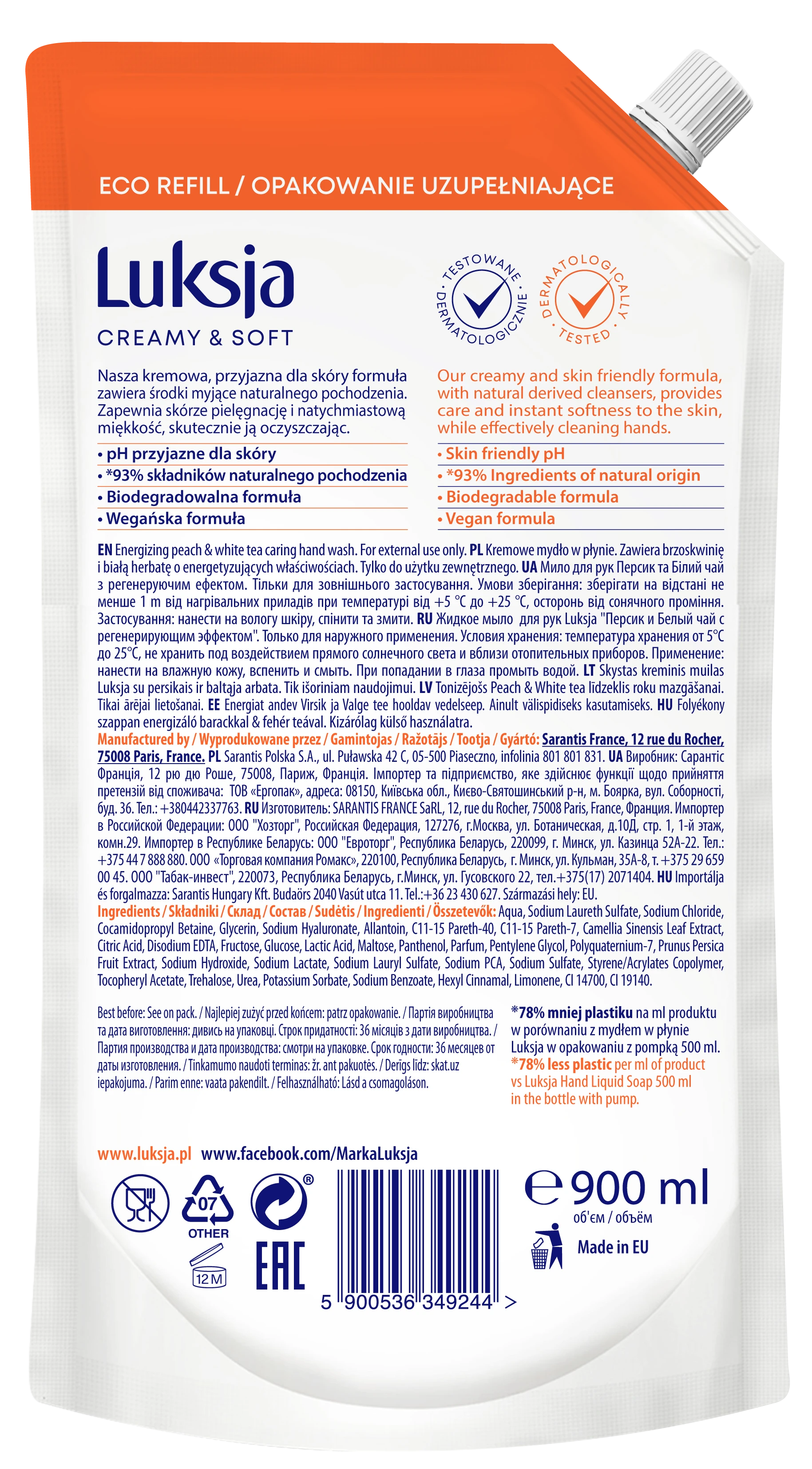 Luksja Creamy & Soft Kremowe mydło w płynie Brzoskwinia i Biała Herbata 900 ml opakowanie uzupełniające