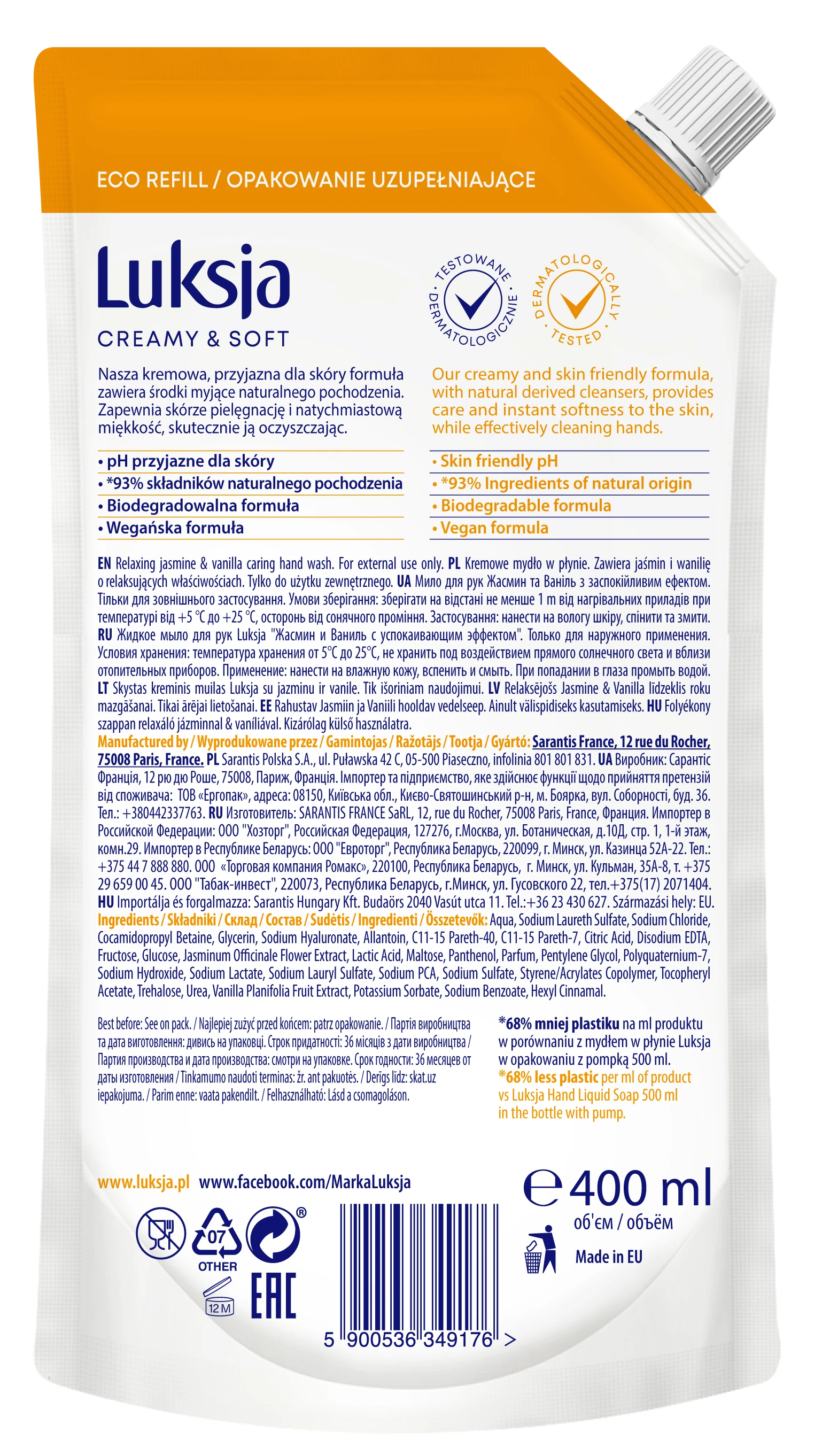 Luksja Creamy & Soft Kremowe mydło w płynie Jaśmin i Wanilia 400 ml opakowanie uzupełniające