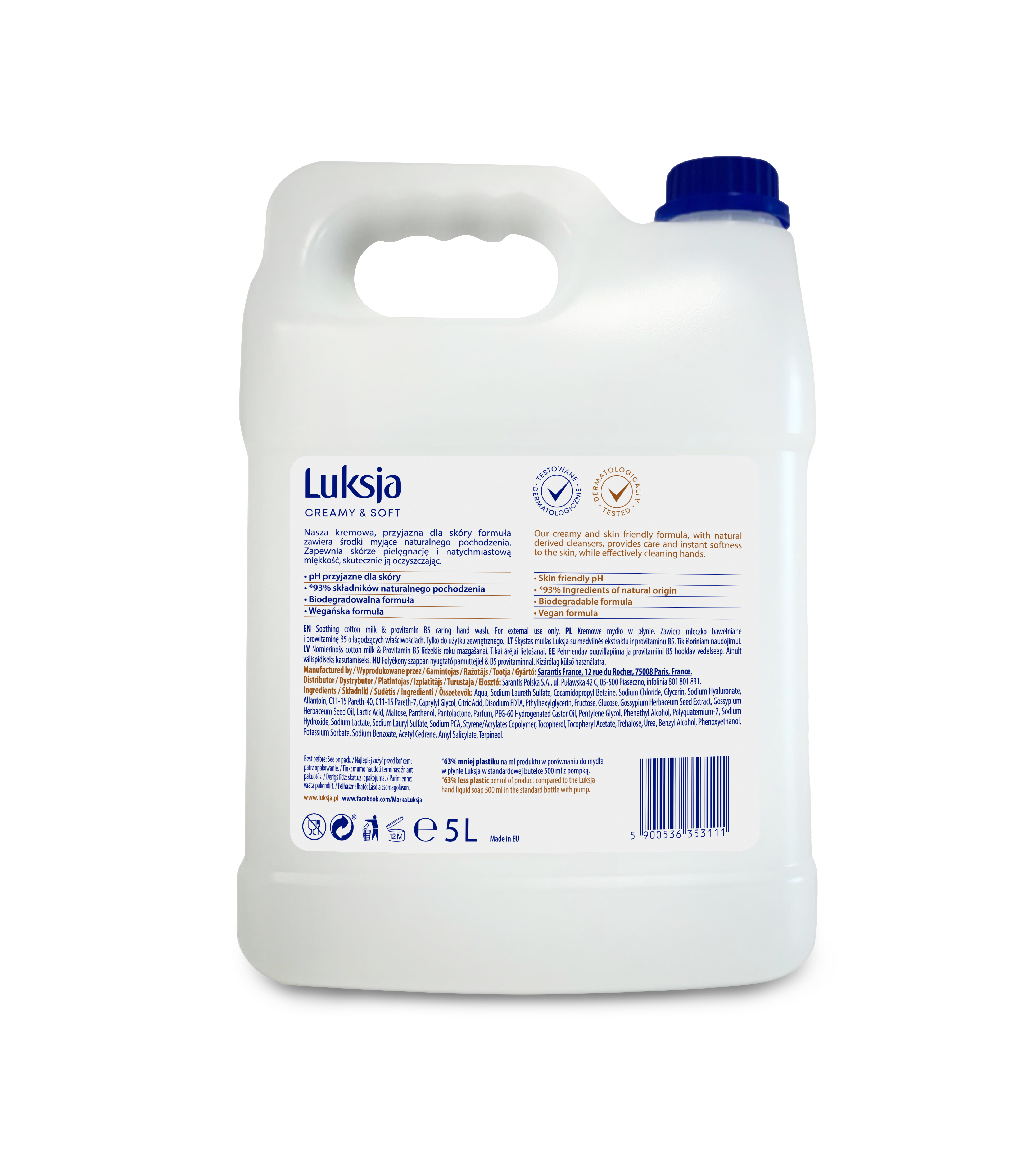 Kremowe mydło w płynie Luksja Mleczko bawełniane i Prowitamina B5 zawiera środki myjące pochodzenia. Skutecznie oczyszcza skórę, zapewniając jej pielęgnację i natychmiastową miękkość. Pozostawia na dłoniach subtelny zapach. Testowane dermatologicznie. pH przyjazne dla skóry. Biodegradowalna i wegańska formuła. 93% składników pochodzenia. Od teraz dostępne w formacie 5L!