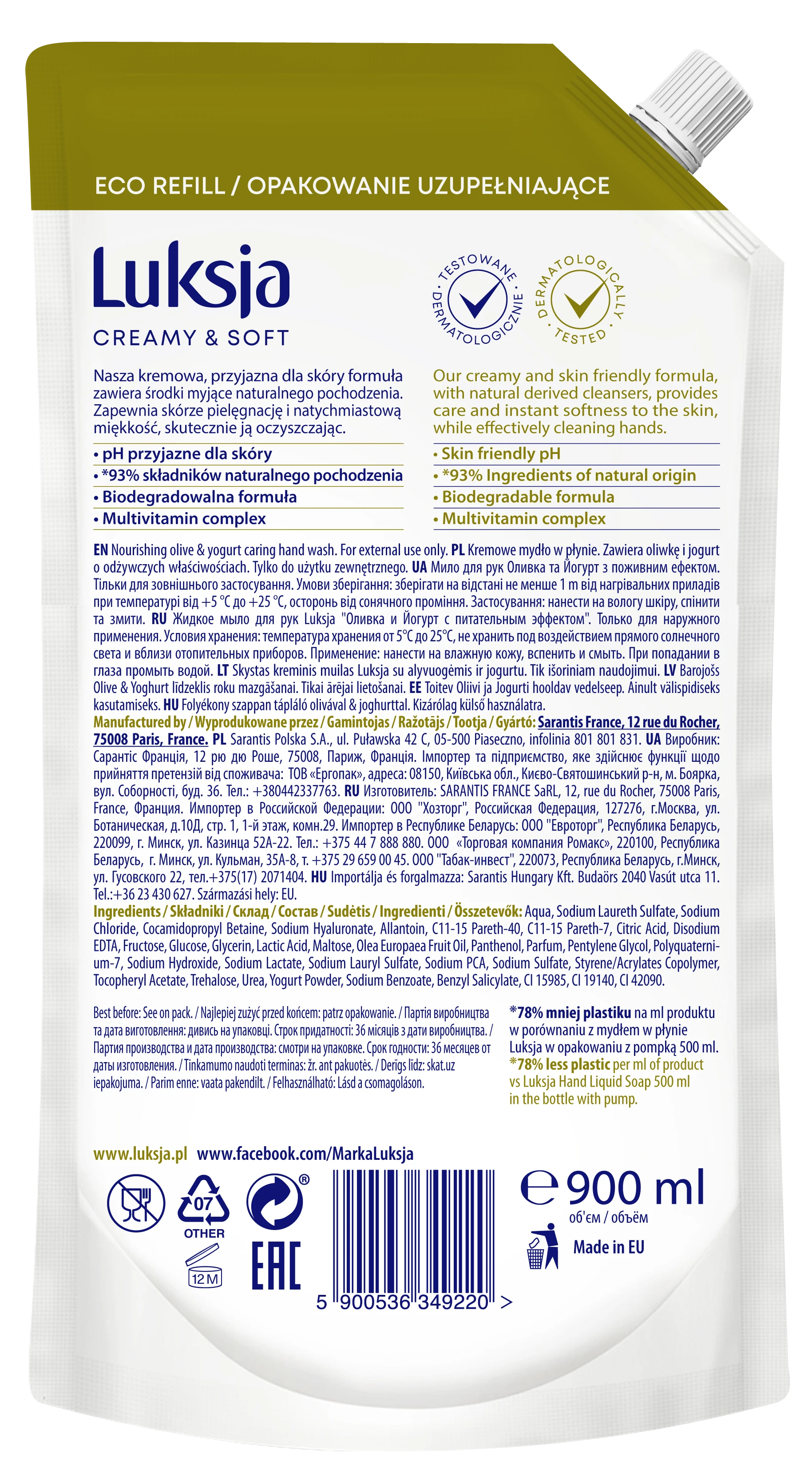 Luksja Creamy & Soft Kremowe mydło w płynie Oliwka i Jogurt 900 ml opakowanie uzupełniające