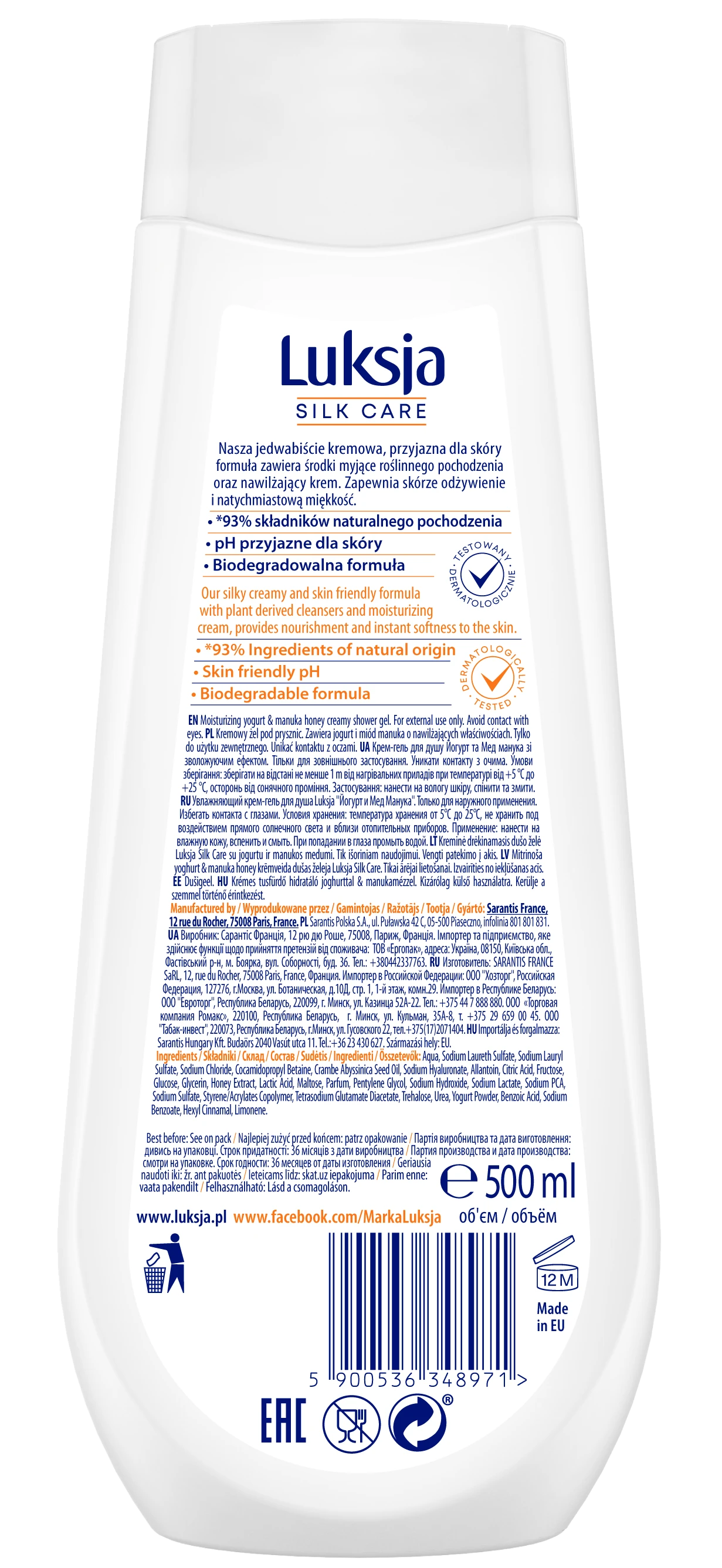 Luksja Silk Care Kremowy żel pod prysznic Jogurt i Miód manuka 500 ml