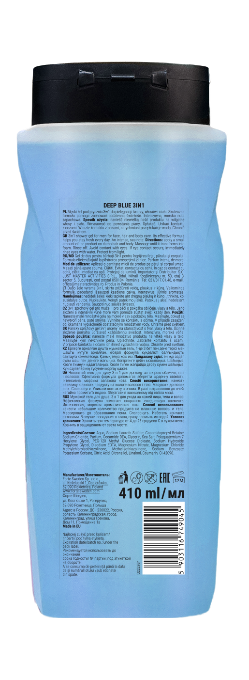 Męski żel pod prysznic 3w1 do pielęgnacji twarzy, włosów i ciała. Skuteczna formuła pomaga zachować codzienną świeżość. Intensywna, morska nuta zapachowa. Sposób użycia: nanieść niewielką ilość produktu na wilgotne włosy i ciało. Wmasować do powstania piany. Spłukać. Unikać kontaktu z oczami. W razie kontaktu z oczami, natychmiast przepłukać je wodą. Chronić przed światłem.