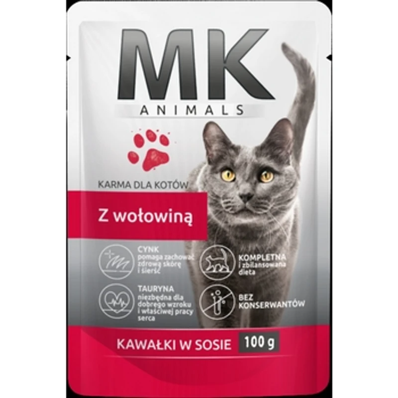 MK Animals saszetka dla kotów z wołowiną. Pełnoporcjowa karma dla kotów wszystkich ras. Kawałki w sosie