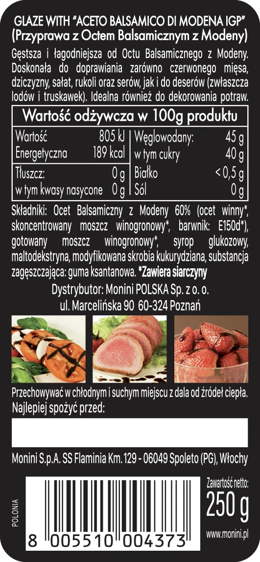 | Składniki | Ocet Balsamiczny z Modeny 60% (ocet winny, skoncentrowany moszcz winogronowy, barwnik: E150d), gotowany moszcz winogronowy, syrop glukozowy, maltodekstryna, modyfikowana skrobia kukurydziana, składnik zagęszczający: guma ksantanowa. Zawiera siarczany. |