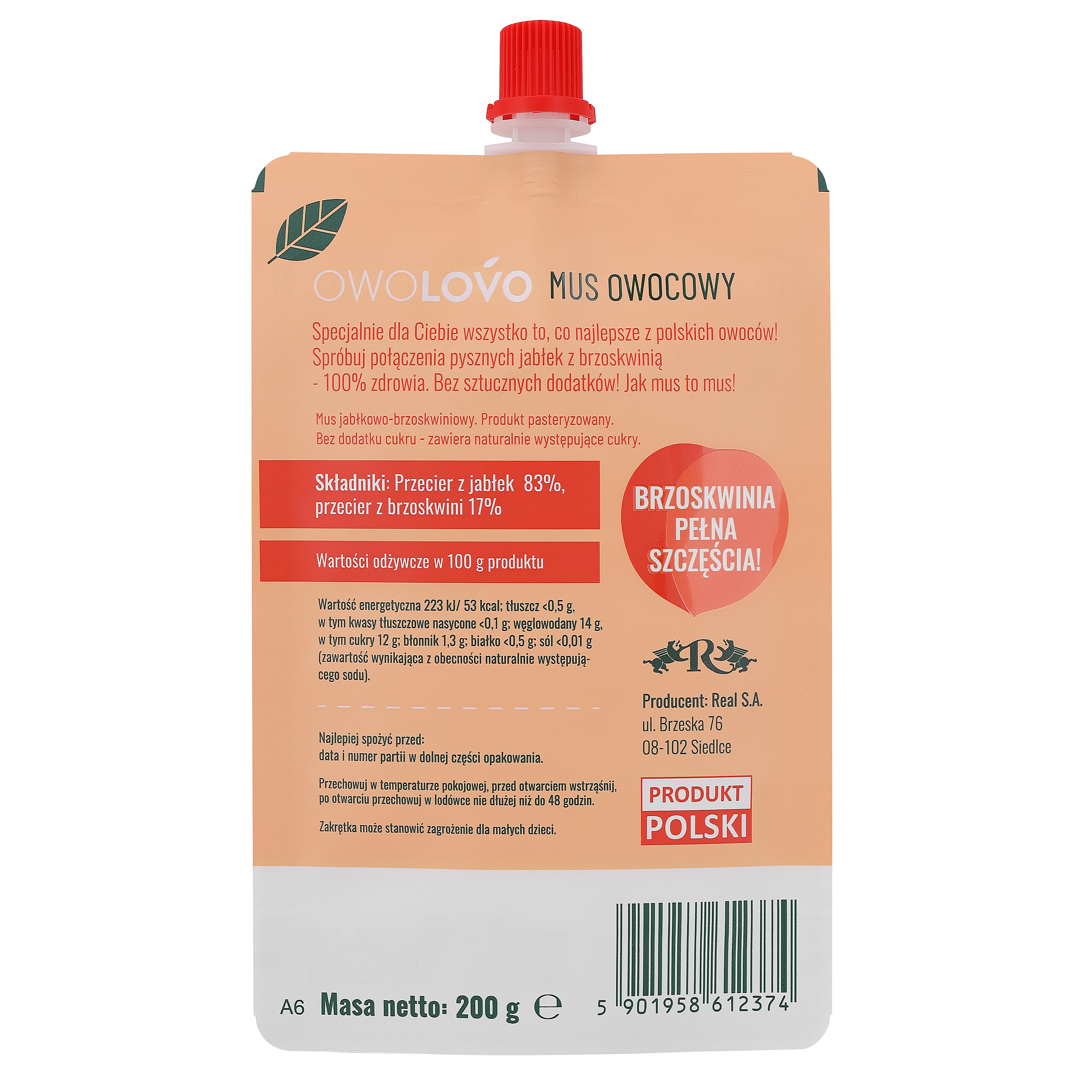 | Krótki opis marketingowy | Brzoskwiniowo * mus jabłkowo-brzoskwiniowy 200g. specjalnie dla ciebie wszystko to, co najlepsze z polskich owoców. spróbuj połączenia pysznych jabłek z brzoskwiniami z sandomierskich sadów – 100% zdrowia. bez sztucznych dodatków! nie zawiera alergenów! |
