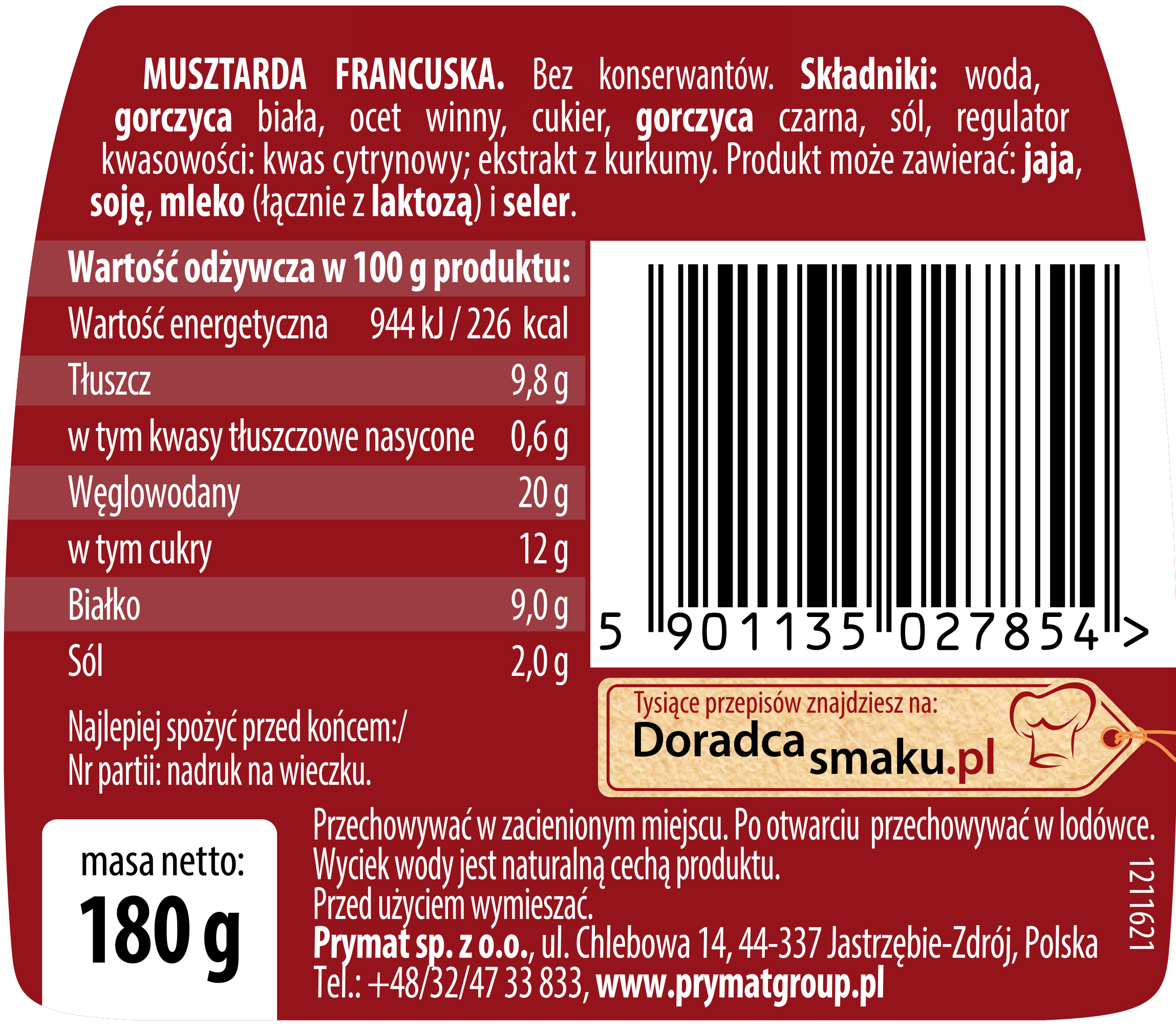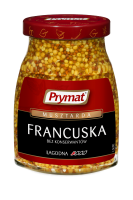 Musztarda francuska Prymat charakteryzuje się łagodnym smakiem i gruboziarnistą konsystencją. Kolorowe ziarna gorczycy oraz dodatek octu winnego czynią z niej wyborny dodatek do potraw mięsnych na ciepło i na zimno, a także do serów, jaj oraz sałatek. Musztarda francuska Prymat stanowi również atrakcyjny element dekoracyjny potraw.