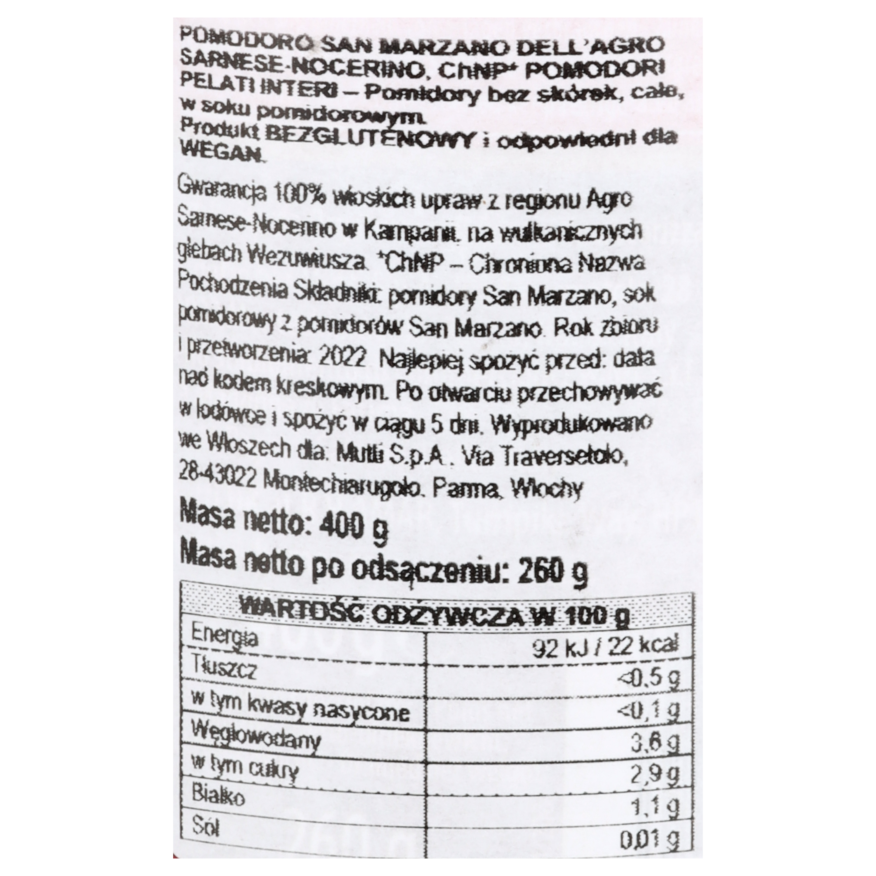 | Składniki | pomidory San Marzano, sok pomidorowy z pomidorów San Marzano. |