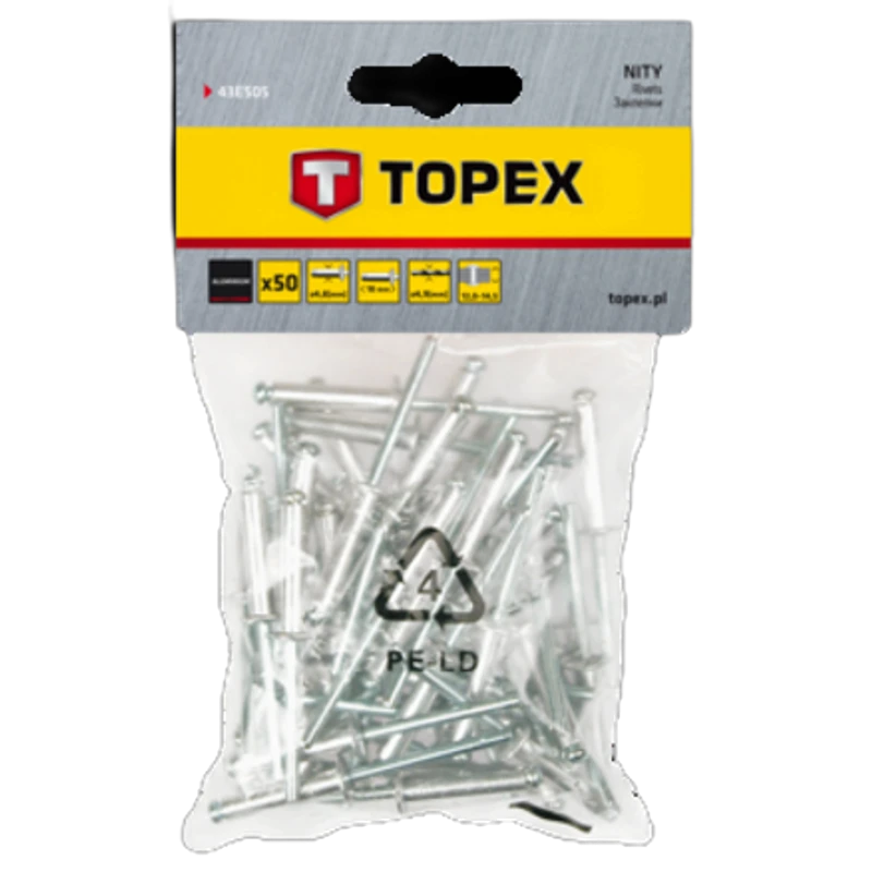 Nity aluminiowe TOPEX (nr ref. 43E505) o wymiarach 4.8 x 18 mm. W opakowaniu 50 sztuk. Nity z łbem kulistym - pełne, do zakuwania. Ten typ nitów zapewnia wyjątkowo mocne połączenie szerokiej gamy elementów, jak blachy, drewno, tworzywa, skóry itp. Nit po zamocowaniu w otworze zakuwa się od strony końca trzpienia, tworząc stałe, odporne na poluzowanie połączenie. Marka TOPEX skierowana jest do majsterkowiczów.