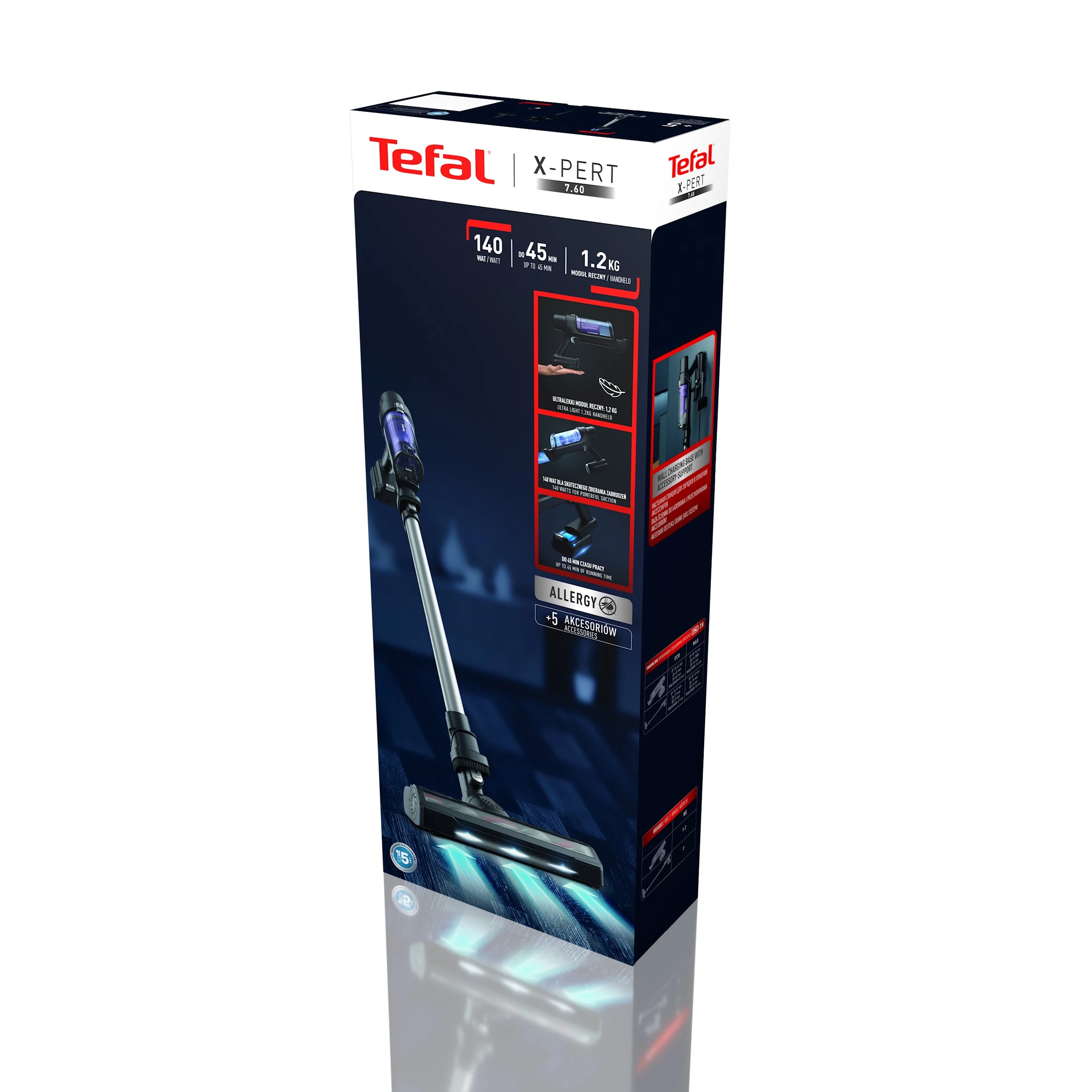 Bezprzewodowy odkurzacz pionowy Tefal X-PERT 7.60 zaprojektowano, aby ułatwić Ci porządki i sprawić, że Twój dom będzie czysty od podłóg aż po same sufity. Silnik o mocy 140 W w połączeniu ze skuteczną elektroszczotką z podświetleniem LED umożliwia dokładne odkurzanie wszystkich rodzajów podłóg, dywanów i chodników. Dzięki bezprzewodowej pracy i lekkiej konstrukcji, z modułem ręcznym o wadze zaledwie 1,2 kg, nowy poziom komfortowego odkurzania jest w zasięgu Twojej ręki.