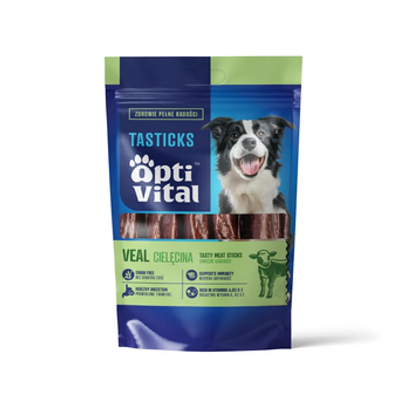 OptiVital Tasticks - karma uzupełniająca dla psów wszystkich ras - kabanosy z cielęciną z dodatkiem rokitnika i dyni 80g