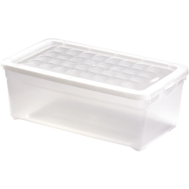 Średnich rozmiarów pojemnik służący do przechowywania części garderoby lub pościeli. Niewielkie rozmiary sprawiają, że z powodzeniem można go zmieścić w szafie. ŚCianki są przeźroczyste, dzięki czemu wiemy co przechowujemy nawet na samym dole pojemnika.