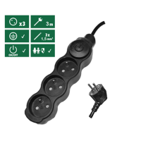 Przedłużacz 3 gniazda z uziemieniem i wyłącznikiem o przekroju 1,5mm2 3m czarny
