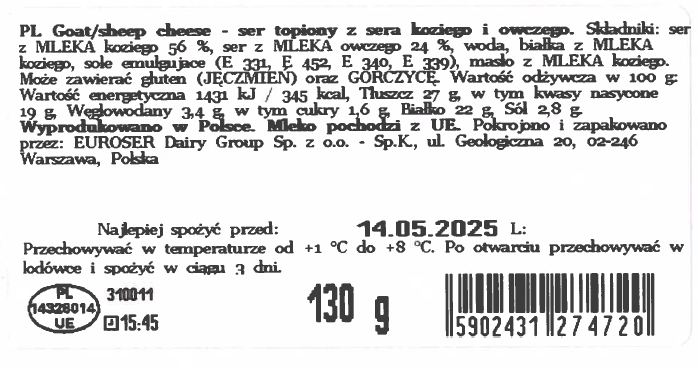 | Składniki | Ser z mleka koziego 56 %, ser z mleka owczego 24 %, woda, białka z mleka koziego, sole emulgujące (e 331, e 452, e 340, e 339), masło z mleka koziego. |