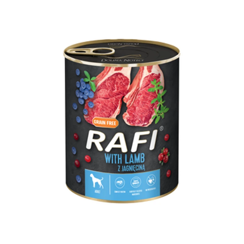 Mięso z jagnięciny to źródło pełnowartościowego białka, witamin z grupy B oraz wielu cennych mikro- i makroelementów warunkujących prawidłowe funkcjonowanie organizmu dorosłego psa. Kwasy tłuszczowe z rodziny n-3 i n-6 wspierają odporność, a także uczestniczą w regulowaniu procesów metabolicznych. Pełnią też funkcję nawilżającą – korzystanie wpływają na stan skóry i sierści. Mokra karma Rafi zawiera odpowiednie proporcje selenu i miedzi. Dodatek tymianku wpływa na atrakcyjność sensoryczną tej mokrej karmy. Mięso i surowce pochodzące z jagnięciny są również źródłem aminokwasów – metioniny, izoleucyny i cystyny. Walory karmy podnoszą obecne w składzie borówka oraz żurawina, źródła wielu cennych witamin i składników odżywczych.