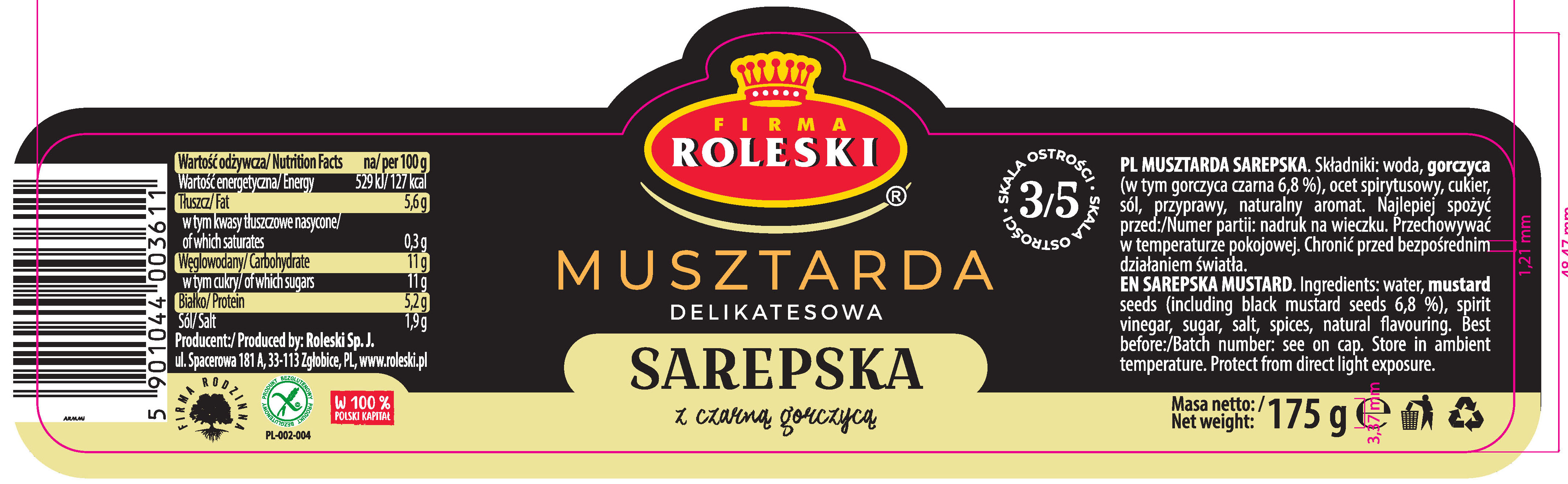 | Składniki | woda, gorczyca, ocet spirytusowy, cukier, sól, przyprawy, aromat. |