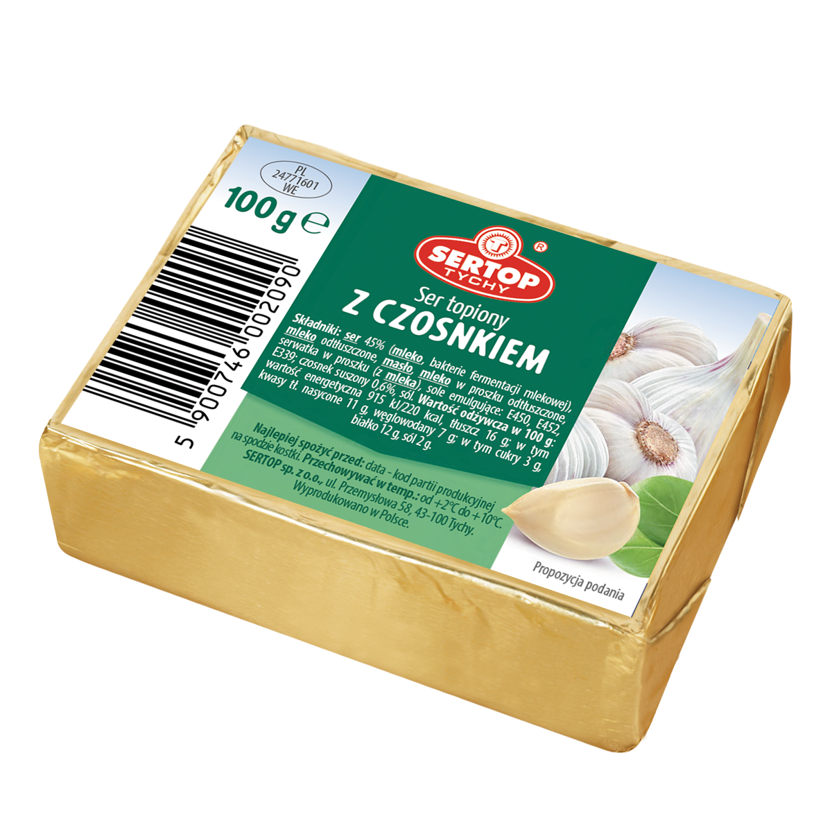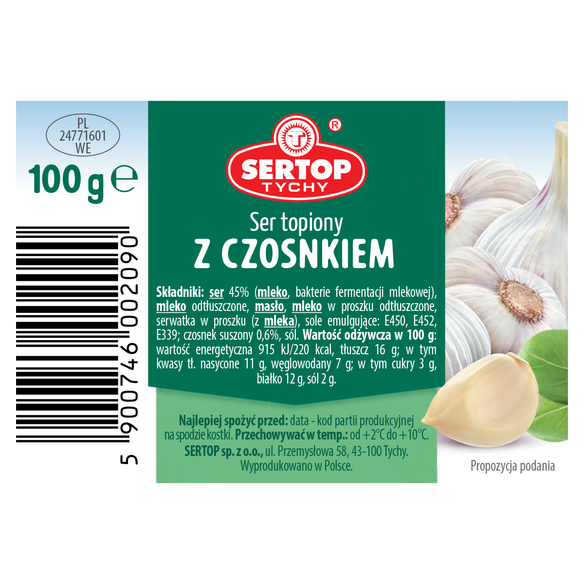 | Składniki | Ser 45% (mleko, bakterie fermentacji mlekowej), mleko odtłuszczone, masło, mleko w proszku odtłuszczone, serwatka w proszku (z mleka), sole emulgujące: e450, e452, e339; czosnek suszony 0,6%, sól |