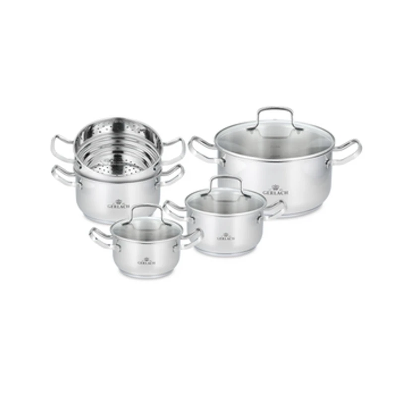 | Zawartość zestawu | Garnek z pokrywką ø 16 cm - 1.5l garnek z pokrywką ø 18 cm - 2.0l garnek z pokrywką ø 20 cm - 2.5l garnek z pokrywką ø 24 cm - 4.5l naczynie do gotowania na parze ø16/18/20 cm |