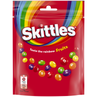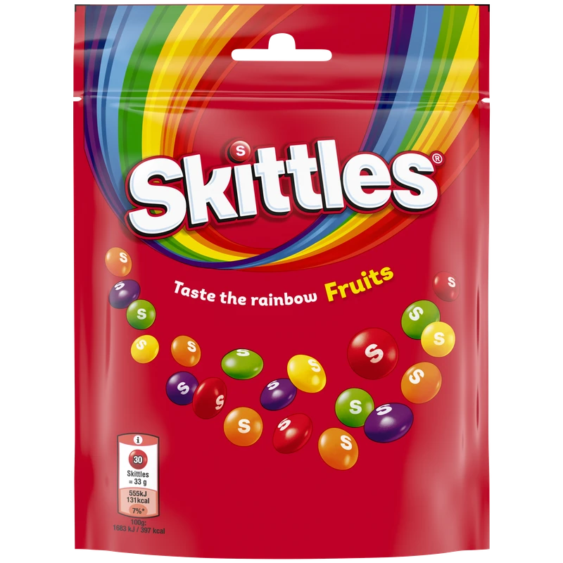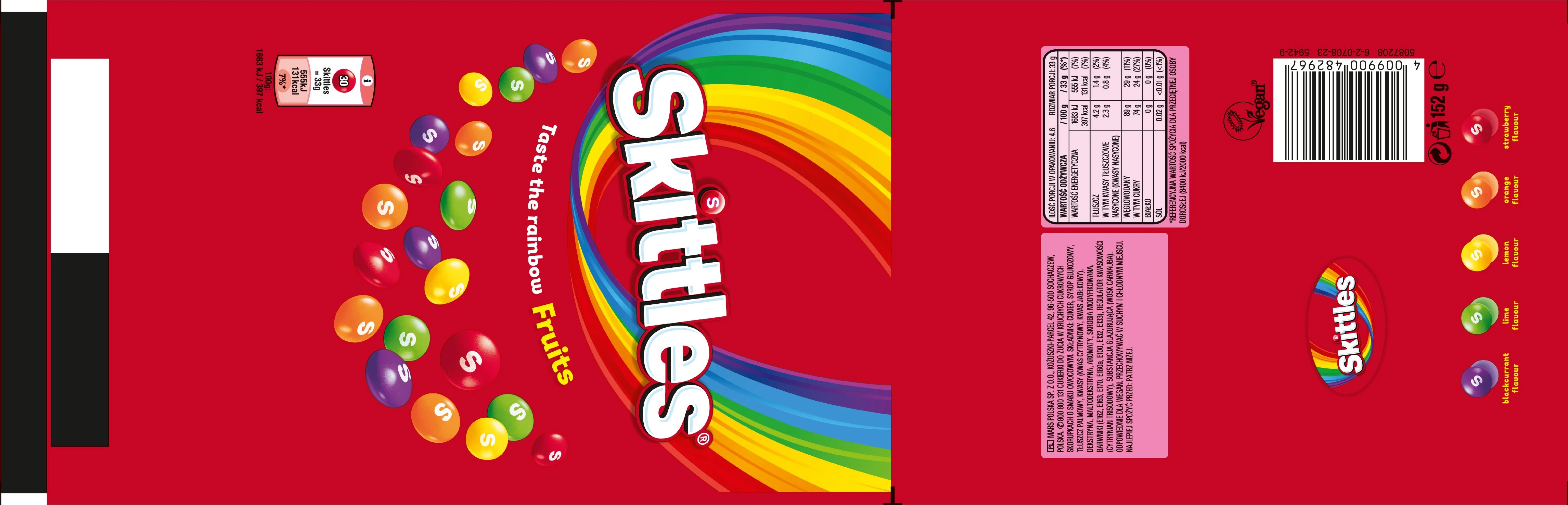 | Składniki | Cukier, syrop glukozowy, tłuszcz palmowy, kwasy (kwas cytrynowy, kwas jabłkowy), dekstryna, maltodekstryna, aromaty, skrobia modyfikowana, barwniki (e 162, e163, e170, e160a, e100, e132, e133), regulator kwasowości (cytrynian trisodowy), substancja glazurująca (wosk carnauba). |