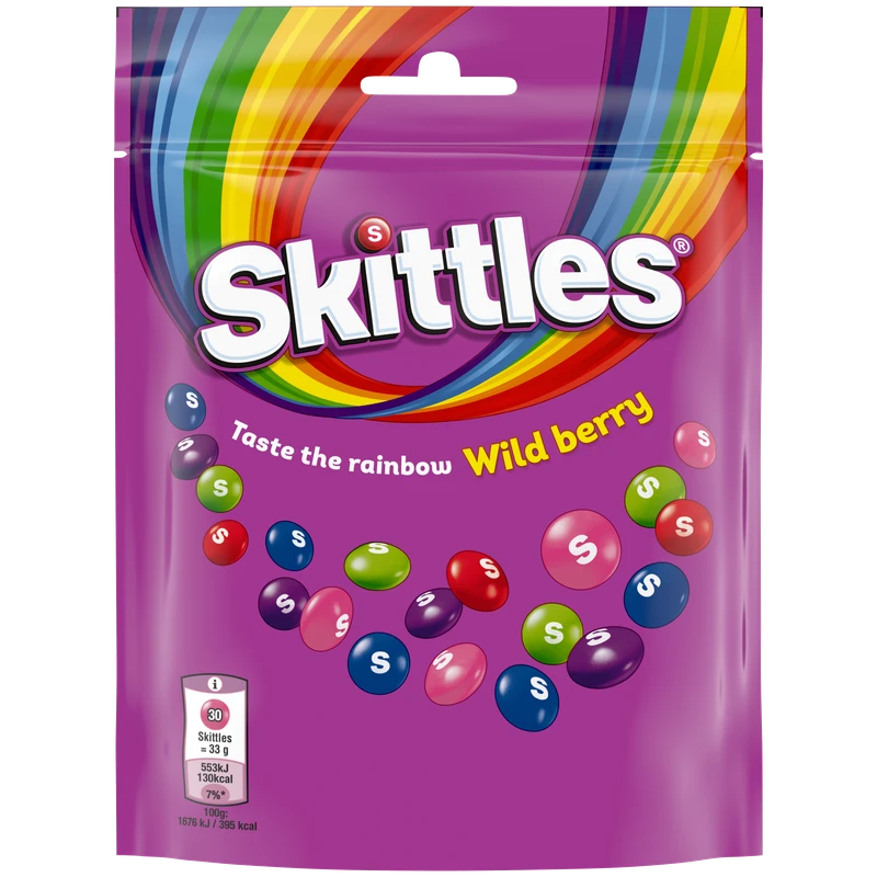 | Składniki | Cukier, syrop glukozowy, tłuszcz palmowy, kwas (kwas cytrynowy), dekstryna, maltodekstryna, aromaty, skrobia modyfikowana, regulator kwasowości (cytrynian trisodowy), substancja glazurująca (wosk carnauba), koncentraty (słodkie ziemniaki, rzodkiewka), barwniki (e170, e100, e132, e133, e160a, e162, e163, emulgator (lecytyna). |