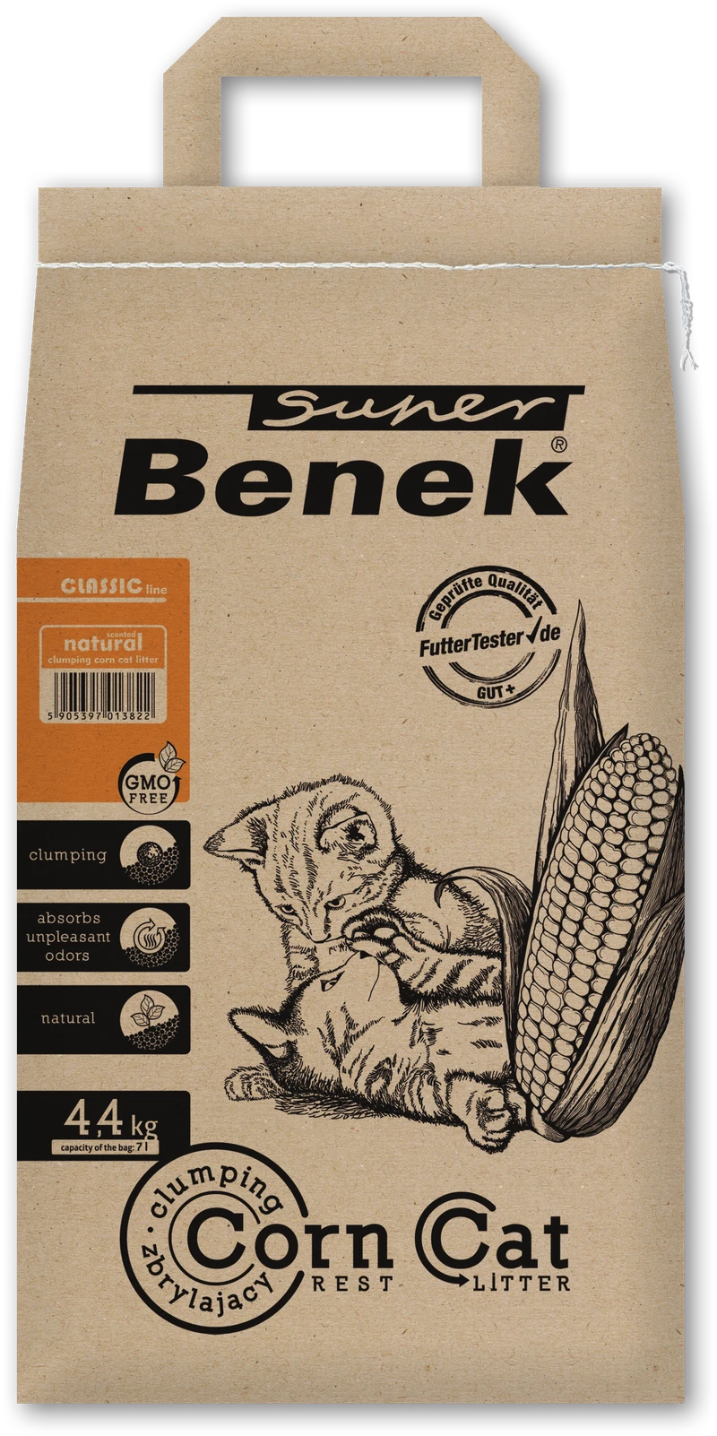 Żwirek dla kotów Super Benek - KUKURYDZIANY , ZBRYLAJĄCY. Idealne podłoże dla kotów dorosłych i kociąt a także dla królików, gryzoni i ptaków. Podłoże wyprodukowane na bazie surowca. Przyjazne dla środowiska i zwierząt. Ulega biodegradacji. Doskonale pochłania wilgoć i nieprzyjemne zapachy zapewniając poczucie komfortu i niezbędną higienę. Pojedyncze bryłki dają się usuwać droga sanitarną. Należy stosować się do lokalnych przepisów prawa w tym zakresie. Nie wsypywać większych porcji! Produkt . Skład: materiał pochodzenia roślinnego. Najlepiej zużyć przed upływem 12 miesięcy od daty produkcji podanej na opakowaniu. Masa netto: 4,4 kg / pojemność opakowania: 7 L.