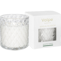 Świeca zapachowa marki Valpe w eleganckim szkle o strukturze kryształu. Produkt wpisujący się w koncepcję nowoczesnych wnętrz i pasujący do wielu stylów.