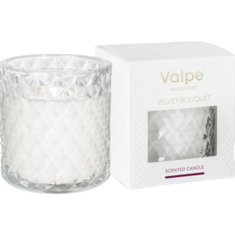 Świeca zapachowa marki Valpe w eleganckim szkle o strukturze kryształu. Produkt wpisujący się w koncepcję nowoczesnych wnętrz i pasujący do wielu stylów.