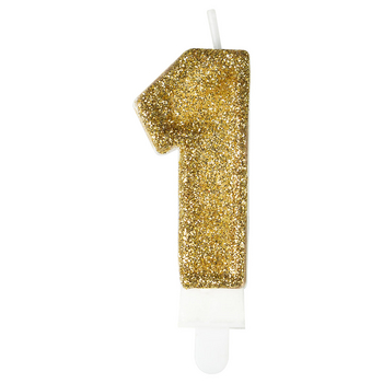 Świeczka w kształcie cyferki 1 w kolorze złotym, pokryta połyskującym eko-brokatem, to idealny dodatek do każdej imprezy urodzinowej. Wykonana z myślą o środowisku – pokryta drobinkami biodegradowalnego brokatu, bez mikroplastiku.