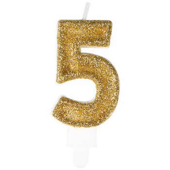 Świeczka w kształcie cyferki 5 w kolorze złotym, pokryta połyskującym eko-brokatem, to idealny dodatek do każdej imprezy urodzinowej. Wykonana z myślą o środowisku – pokryta drobinkami biodegradowalnego brokatu, bez mikroplastiku.