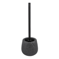 Materiał: kamionka. Szczotka toaletowa z serii Hades. Pojemnik na szczotkę został wykonany z kamionki w kolorze ciemnego, matowego antracytu. Posiada nieregularne, nakrapiane plamki w kolorze czarnym, które nadają mu niezwykłego charakteru. Rączka szczotki została wykonana ze stali malowanej na kolor czarnego matu, natomiast część czyszcząca z tworzywa sztucznego w kolorze czarnym. Średnica jeża to ok. 7,5 cm.