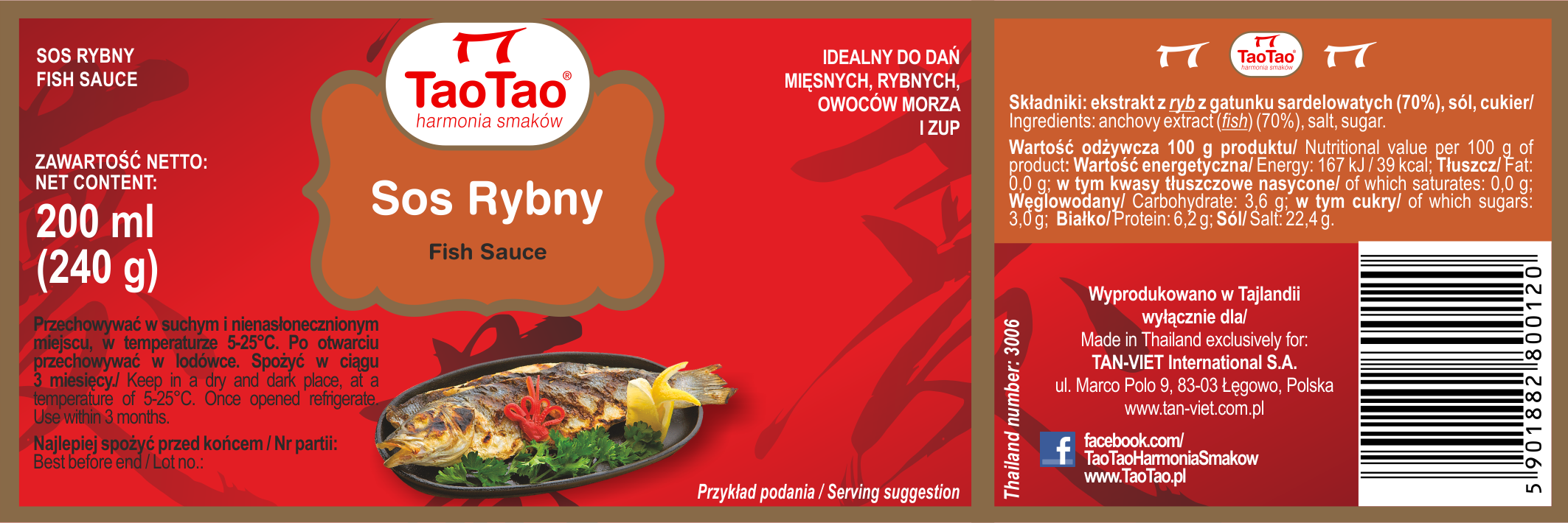 dzięki swemu Intensywnemu smakowi sos rybny doskonale nadaje się do doprawiania i dosalania dań rybnych i mięsnych. Dodajemy go w ostatniej fazie gotowania. Sos dobrej jakości odznacza się przejrzystym, brązowym kolorem. Sos rybny TaoTao w połączeniu z sokiem z cytryny i słodkim sosem chili TaoTao tworzy smakowity dodatek do sałatek.
