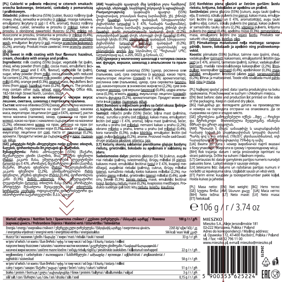 | Składniki | Składniki: polewa mleczna (55%) [cukier, tłuszcz roślinny (palmowy, shea), serwatka w proszku (z mleka), miazga kakaowa, emulgatory: lecytyny (z soi) i e 476, aromat], tłuszcz roślinny (palmowy), cukier, serwatka w proszku (z mleka), kakao w proszku o obniżonej zawartości tłuszczu (2,2%), mleko odtłuszczone w proszku, śmietanka w proszku (z mleka) (0,4%), skórka pomarańczowa (0,3%), miazga orzeszków arachidowych, emulgator: lecytyny (z soi), miazga orzechów laskowych (0,2%), aromaty. |