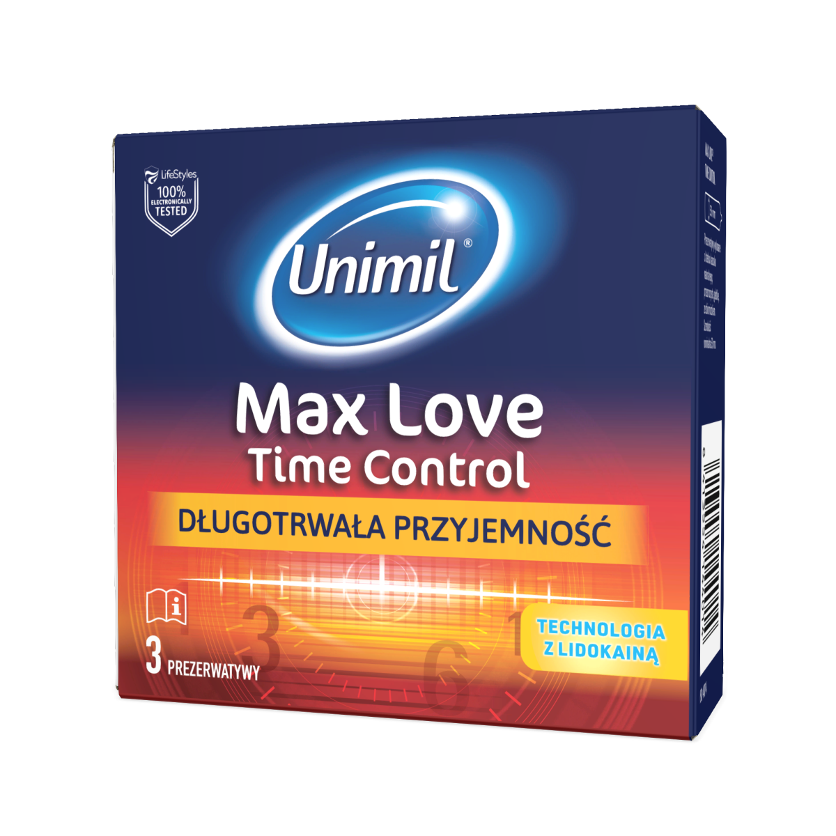 Unimil® Max Love® Time Control to prezerwatywy ze środkiem zawierającym chlorowodorek lidokainy pomagającym kontrolować moment wytrysku i wydłużający czas podniecenia seksualnego u mężczyzn.