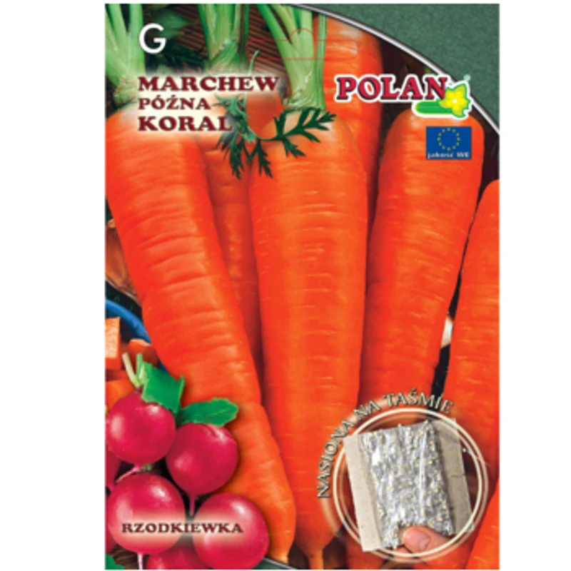 Nasiona na TAŚMIE marki PlantiCo. Marchew Koral odmiana późna, bardzo plenna, w typie Flakkee. Korzeń o gładkiej skorce bez zazielenienia. Kora i walec osiowy bardzo dobrze wybarwione. Szczególnie polecana do przemysłu na soki i krajanki oraz do długiego przechowywania, nadaje się do mechanicznego zbioru.
