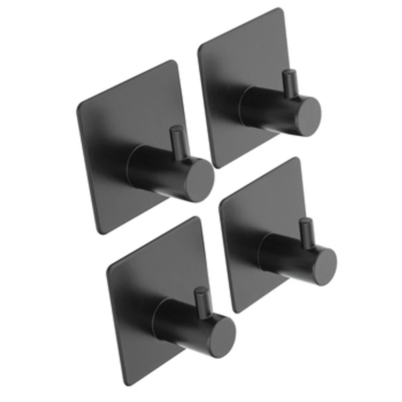 Zestaw czterech samoprzylepnych wieszaków wykonanych ze stali malowanej proszkowo na czarno.