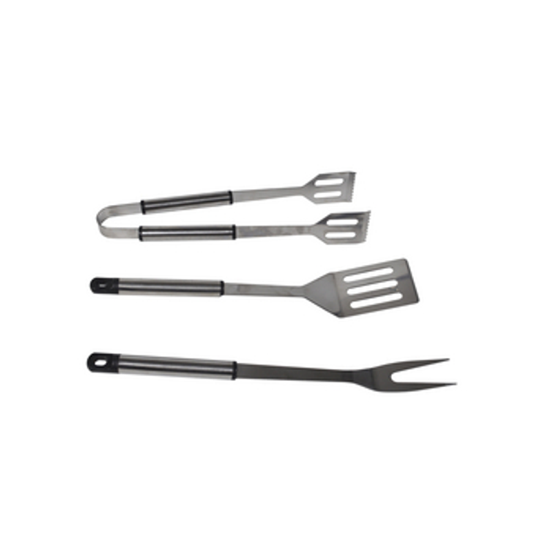 Zestaw zawiera trzy stalowe sztućce do grilla: łopatka (36x7cm), widelec (37x3,5cm) oraz szczypce (36x4,5cm).