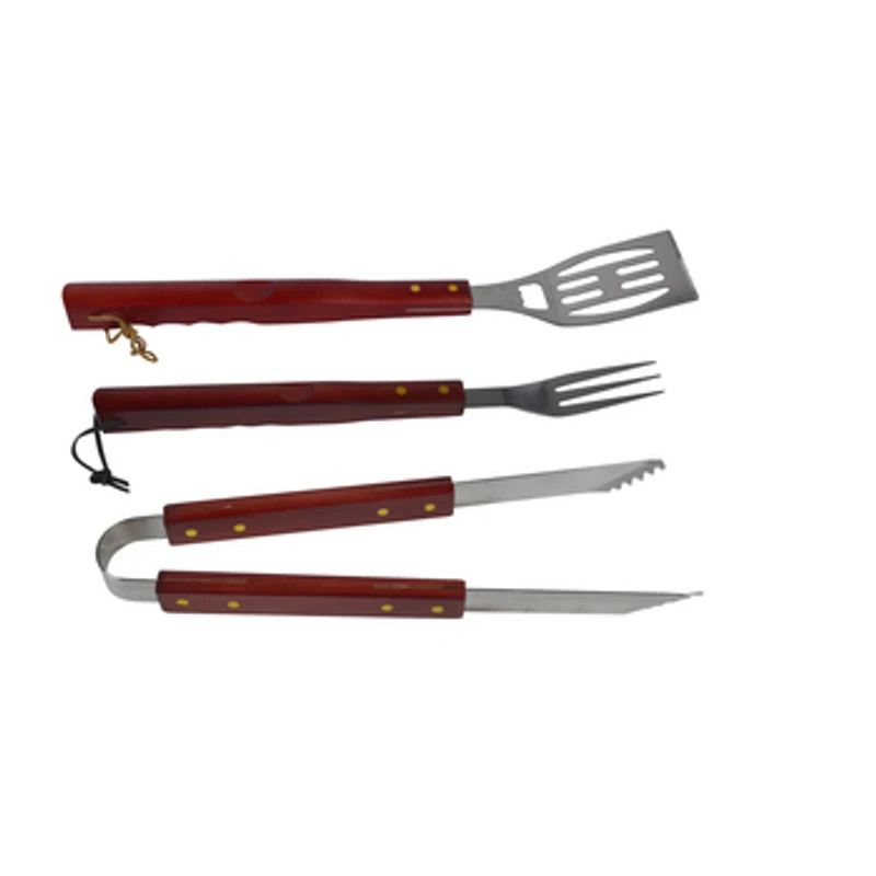 Zestaw zawiera trzy sztućce do grilla: łopatka (39x7cm), widelec (37x3cm) oraz szczypce (42x4cm). Rączki pokryte drewnem.