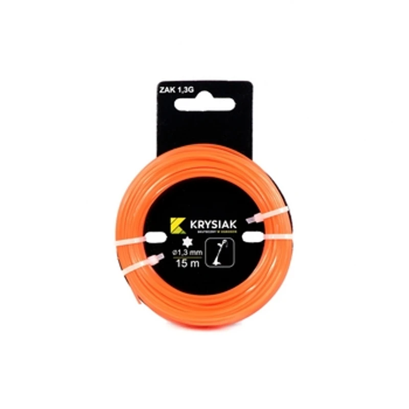 Uniwersalna żyłka tnąca gwiazdkowa 1,3 mm x 15 m do podkaszarek i kos. Żyłka tnąca firmy Krysiak przeznaczona jest głównie do użytku przydomowego oraz do pracy w ogrodzie lub na działce. Żyłka znajdzie zastosowanie głównie przy pielęgnacji trawników oraz wykaszaniu wysokiej trawy i chwastów o miękkich łodygach. Różnorodny zakres dostępnych średnic żyłki tnącej (od 1,3 mm do 3,0 mm) pozwala na jej dostosowanie w niemal wszystkich podkaszarkach i kosach spalinowych. Gwiazdkowy kształt przekroju żyłki zapewnia jej dużą wytrzymałość oraz umożliwia równą i wydajną pracę, zarówno elektrycznych jak i spalinowych podkaszarek oraz kos (również mniejszej mocy). Dodatkowo gwiazdkowe żyłki cechuje agresywna charakterystyka koszenia.