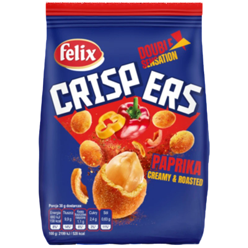 | Składniki | Składniki: orzeszki ziemne (50,5 %), skrobia (w tym pszenna), olej słonecznikowy, cukier, sól, skrobia modyfikowana, naturalny aromat, papryka w proszku (0,6 %), czosnek w proszku, cebula w proszku, maltodekstryna, ser cheddar w proszku (z mleka), ser mozarella w proszku (z mleka), regulator kwasowości: kwas cytrynowy, fosforany wapnia, fosforany sodu; przyprawy, barwnik: kurkumina; ekstrakt z rozmarynu. |