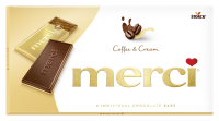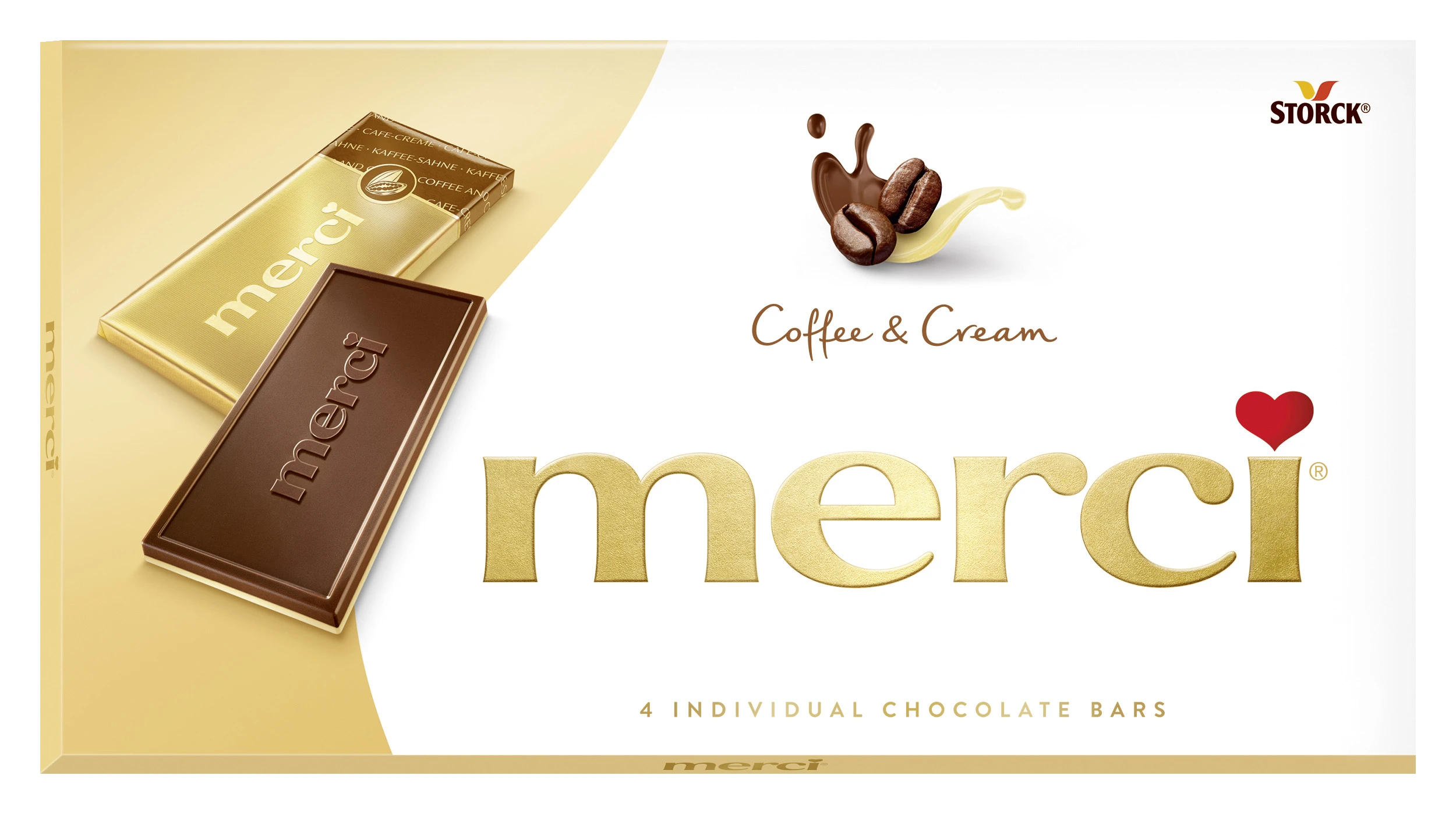 Merci czekolada to pojedynczo pakowane wykwintne 4 sztuki czekolady kawowo-śmietankowej. Merci czekolady są smaczną przekąską dla siebie, jak również są dobrym prezentem, o wysokiej jakości i na każdą okazję.