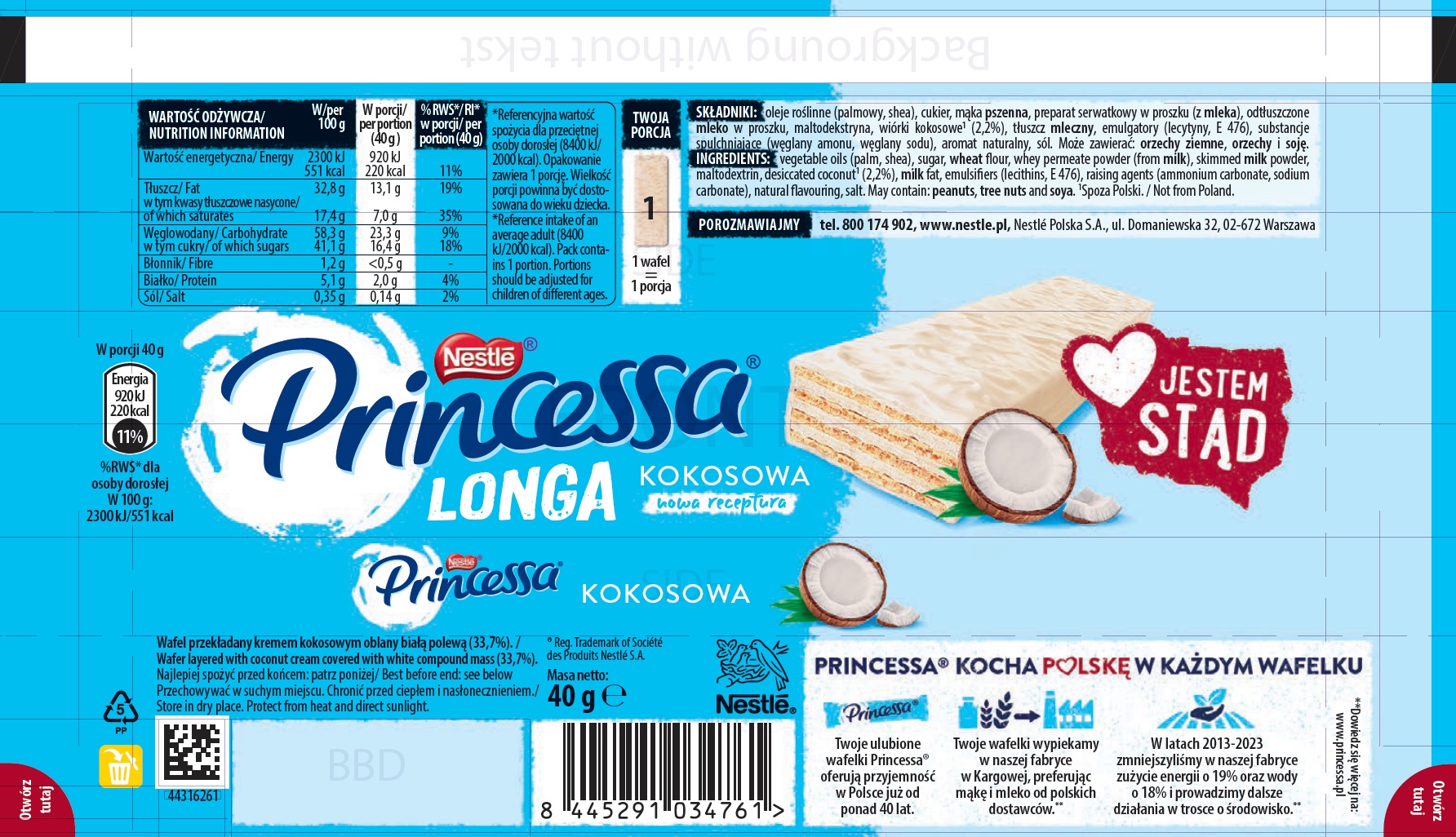 Princessa Longa Kokosowa to delikatny i chrupiący wafelek przełożony puszystym kremem kokosowym, oblany delikatna białą czekoladą, który po prostu rozpływa się w ustach. To idealny wybór na małą chwilę przyjemności w ciągu dnia. Większy rozmiar wafelka pozwala dłużej cieszyć się wyjątkowym smakiem. Wafelki Princessa od początku swojego istnienia są produkowane w jednej i tej samej fabryce w Polsce.