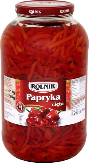 Papryka cięta Rolnik to paski soczystej, czerwonej papryki, zanurzone w , octowej marynacie, pełnej aromatycznych przypraw.
