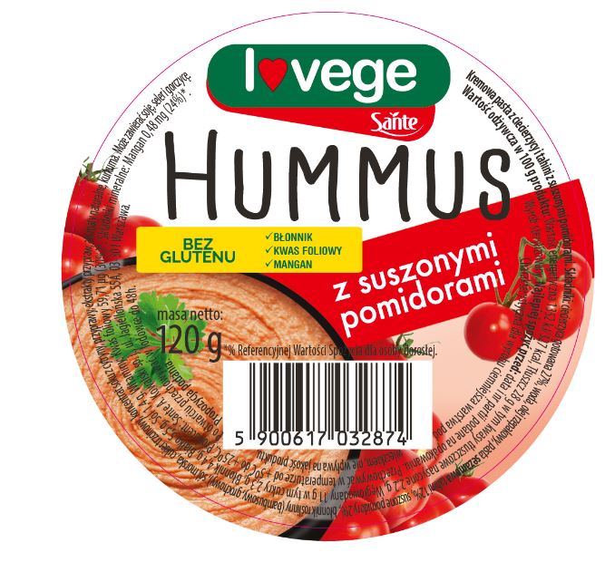 Hummus Sante to produkt pochodzenia roślinnego bez sztucznych dodatków, konserwantów i ulepszaczy smaku, o niskim indeksie glikemicznym. Nie zawiera glutaminianu sodu.