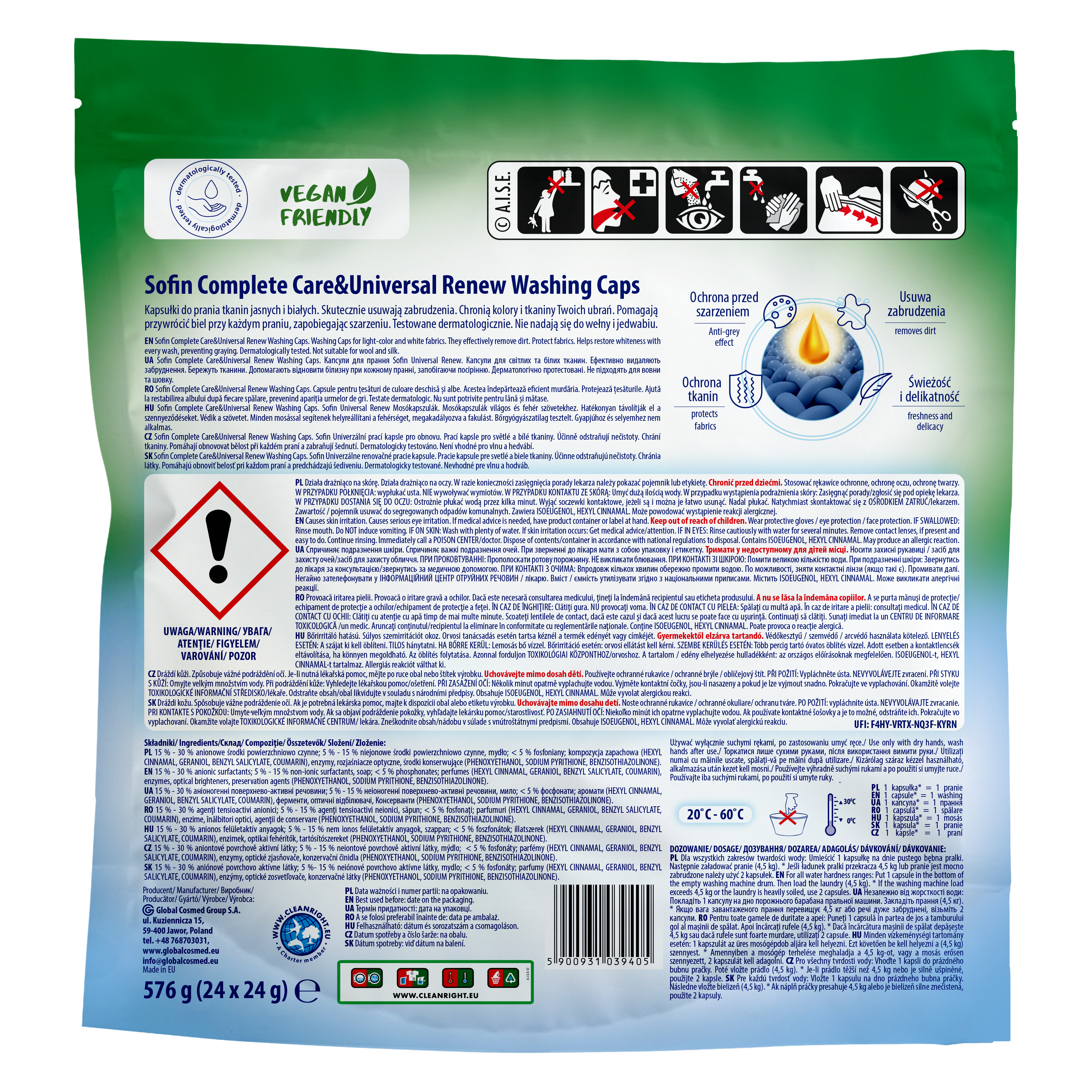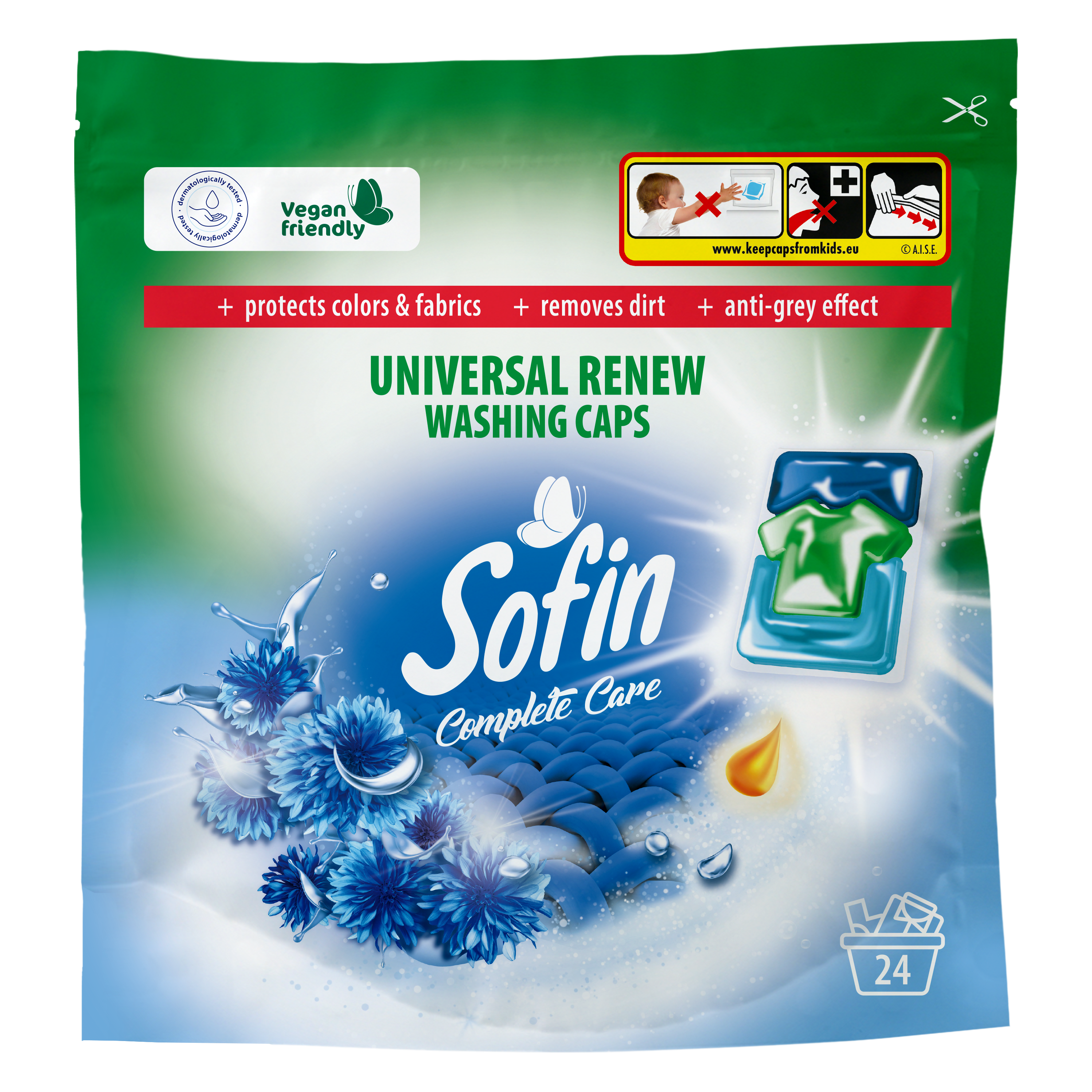 Sofin Complete Care&Universal Renew Washing Caps – kapusłki do prania tkanin jasnych i białych 24 szt. Ochrona jasnych i białych kolorów Ochrona przed szarzeniem Ochrona tkanin Usuwanie zabrudzeń Świeżość i delikatność – atrakcyjny zapach! Vegan friendly Testowane dermatologicznie