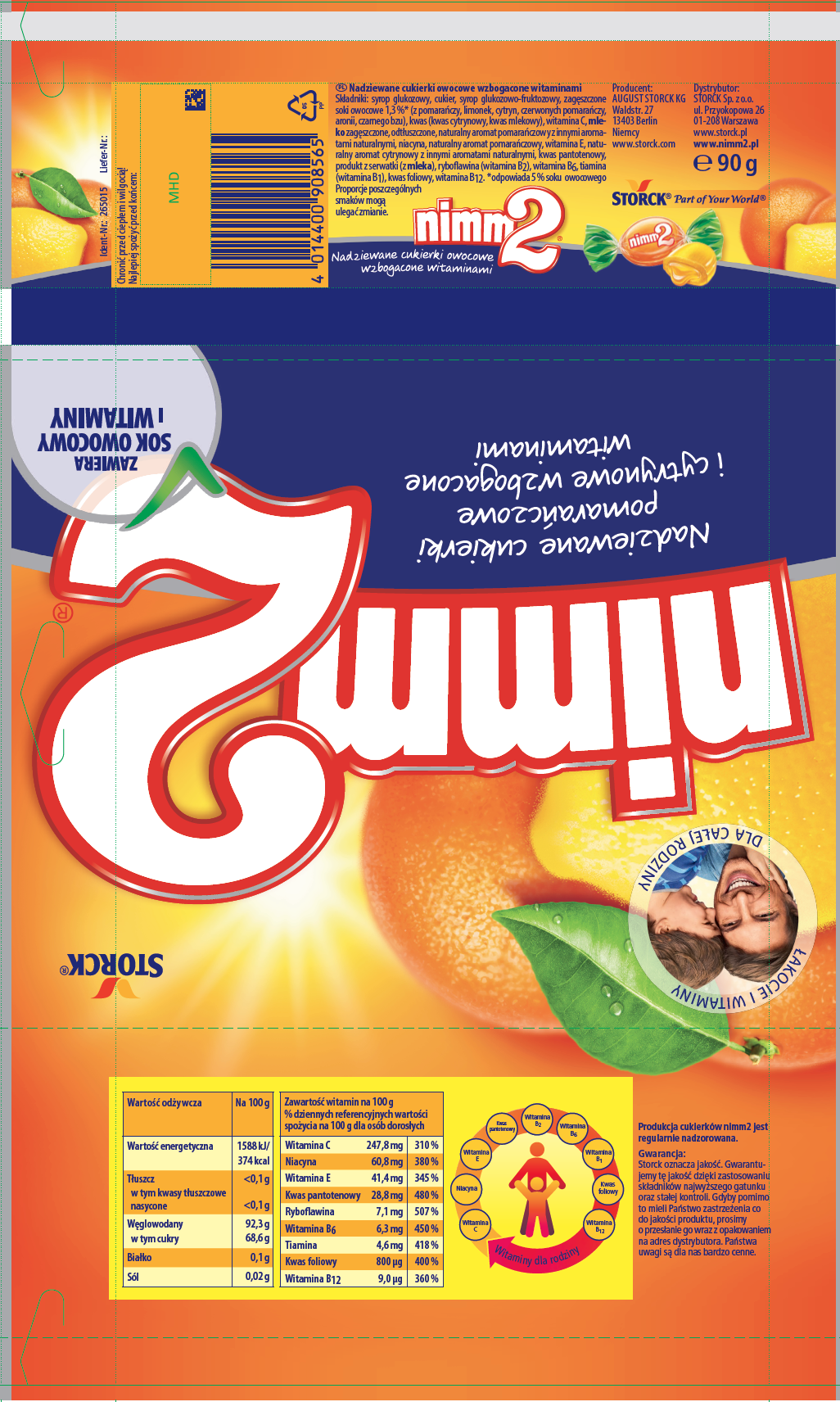 | Składniki | syrop glukozowy, cukier, syrop glukozowo-fruktozowy, zagęszczone soki owocowe 1,3 %* (z pomarańczy, limonek, cytryn, czerwonych pomarańczy, aronii, czarnego bzu), kwas (kwas cytrynowy, kwas mlekowy), witamina C, mleko zagęszczone, odtłuszczone, aromat pomarańczowy z innymi aromatami , niacyna, aromat pomarańczowy, witamina E, aromat cytrynowy z innymi aromatami , kwas pantotenowy, produkt z serwatki (z mleka), ryboflawina (witamina B2), witamina B6, tiamina (witamina B1), kwas foliowy, witamina B12. *odpowiada 5 % soku owocowego Proporcje poszczególnych smaków mogą ulegać zmianie. |