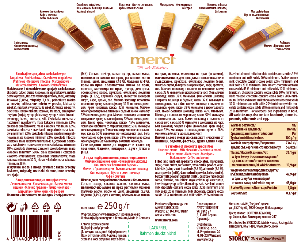 | Składniki | cukier, tłuszcz kakaowy, miazga kakaowa, mleko pełne w proszku, tłuszcze roślinne (palmowy, shea), orzechy laskowe (3,8 %), migdały (3,4 %), pełnotłuste mleko w proszku, odtłuszczone mleko w proszku, laktoza (z mleka), maślanka w proszku (z mleka), tłuszcz mleczny, dekstroza, kakao niskotłuszczowe, fruktoza, emulgator: lecytyny (soja), syrop glukozowy, syrop z cukru inwert-owanego, kawa, aromaty, sól. Czekolada mleczna z nadzieniem nugatowym: masa kakaowa minimum 32 %; czekolada śmietankowa: masa kakaowa minimum 32 %; czekolada mleczna z orzechami i migdałami: masa kakaowa minimum 32 %; czekolada mleczna z nadzieniem pralinowym: masa kakaowa minimum 32 %; czekolada mleczna deserowa: masa kakaowa minimum 45 %; czekolada deserowa z nadzieniem marcepanowym: masa kakaowa minimum 50 %; czekolada deserowa z musem czekoladowym: masa kakaowa minimum 50 %; biała czekolada i czekolada kawowo-śmietankowa: czekolada śmietankowa: masa kakaowa minimum 32 %, biała czekolada: masa kakaowa minimum 28 %. Wszystkie rodzaje mogą zawierać także orzechy laskowe, migdały, orzeszki ziemne, inne orzechy oraz jaja. |