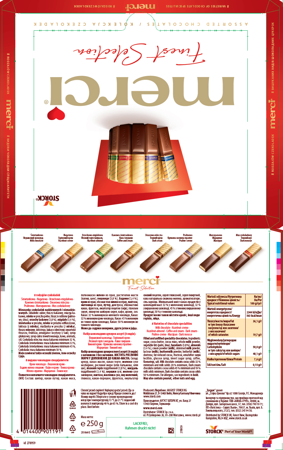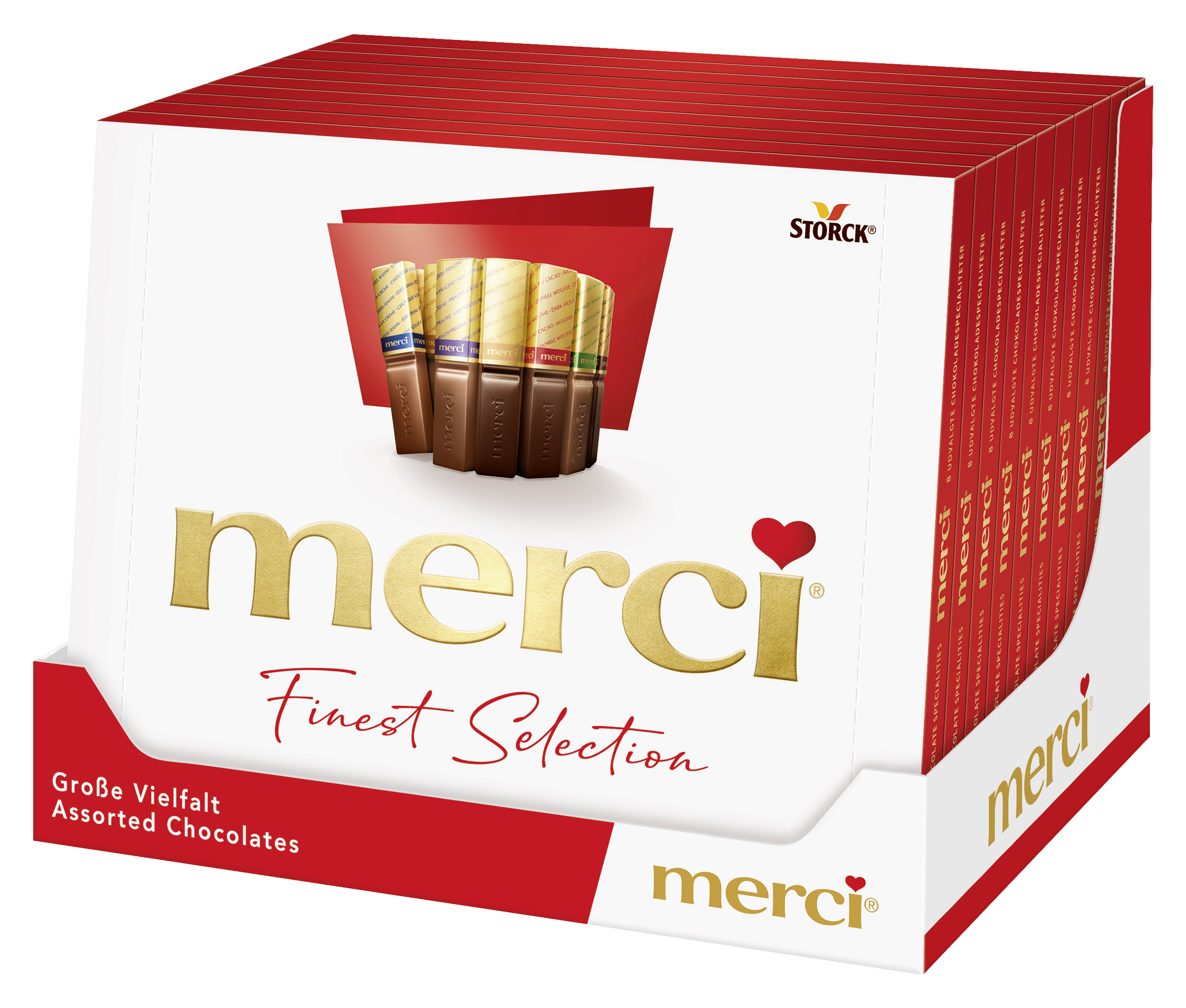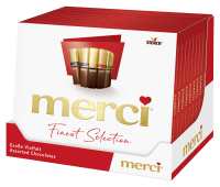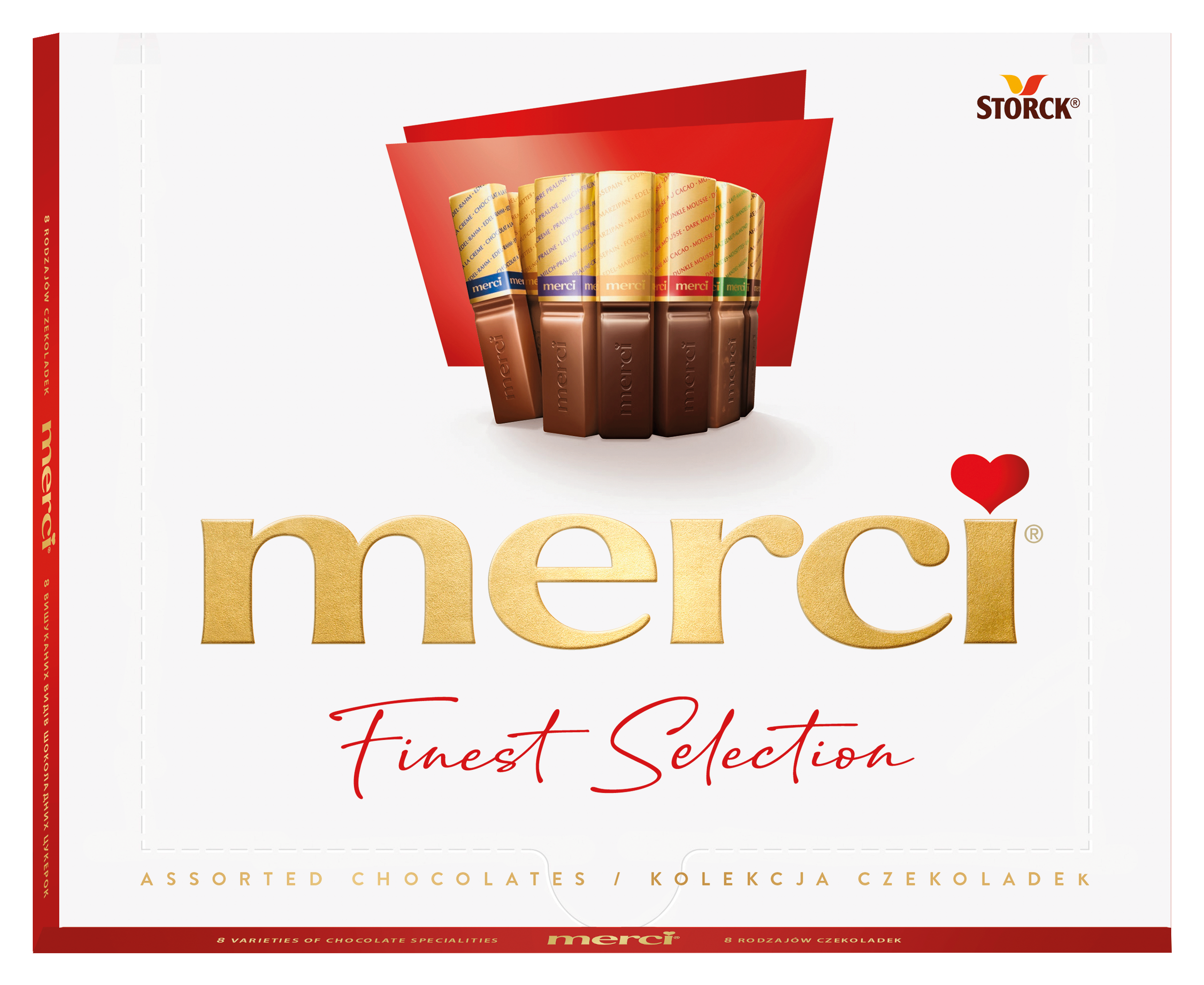 Merci to pojedynczo pakowane wykwintne czekoladki, 8 rodzajów czekoladek w jednej bombonierce. Merci Finest Selection jest unikalnym, czekoladowym prezentem, o wysokiej jakości i na każdą okazję.