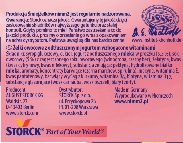 | Składniki | syrop glukozowy, cukier, jogurt z odtłuszczonego mleka w proszku (5,5%), sok owocowy (5%) z zagęszczonego soku owocowego (winogrona, czarny bez), żelatyna, regulatory kwasowości (kwas cytrynowy, kwas mlekowy), substancja żelująca: pektyna, hydrolizowane białko mleka, aromaty, koncentraty barwiące (czarna marchew, spirulina), niacyna, witamina E, kwas pantotenowy, barwiący wyciąg z kurkumy, witamina B6, biotyna, witamina B12, substancje glazurujące (wosk carnauba, wosk pszczeli). |