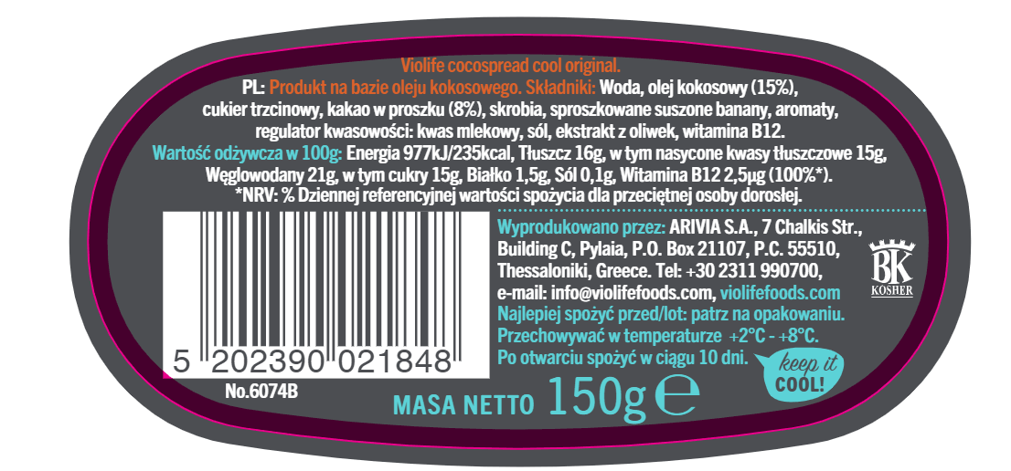 | Składniki | Składniki: woda, olej kokosowy (15%), cukier trzcinowy, kakao w proszku (8%), skrobia, sproszkowane suszone banany, aromaty, regulator kwasowości: kwas mlekowy, sól, ekstrakt z oliwek, witamina B12 |