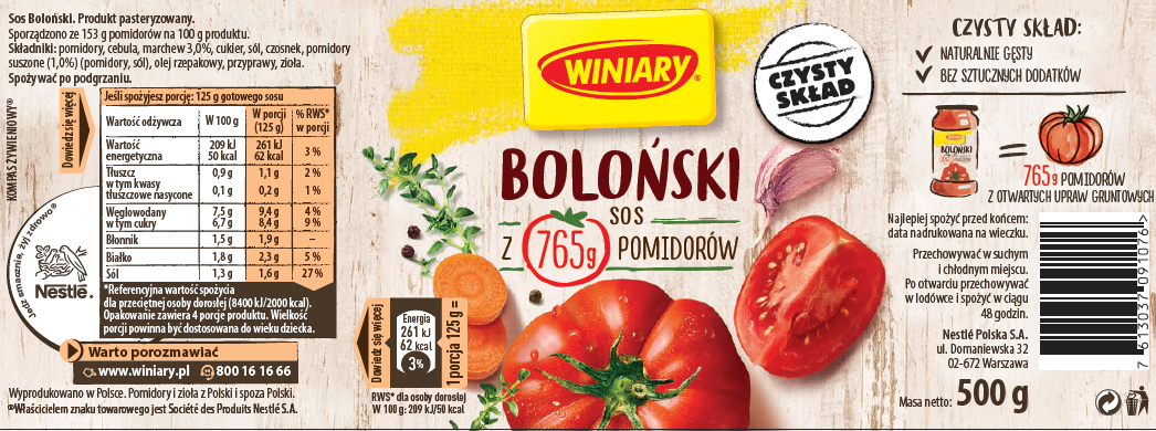 Podstawą sosu Bolońskiego Winiary są pomidory z otwartych upraw gruntowych. Zadbaliśmy o to, żeby było ich jak najwięcej. Duża ilość pomidorów w połączeniu ze starannie dobraną kompozycją ziół i przypraw, sprawia, że smak sosu jest tak wyjątkowy. Dodatkowo ma czysty skład, nie zawiera sztucznych dodatków i skrobi, dzięki czemu jest gęsty.